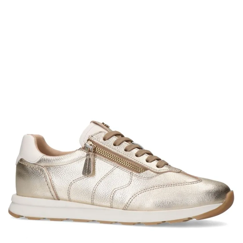 Gouden leren sneakers van het merk No Stress. De sneakers hebben een rits aan de zijkant en een vetersluiting. We adviseren als verzorging en bescherming de Collonil Carbon Pro.