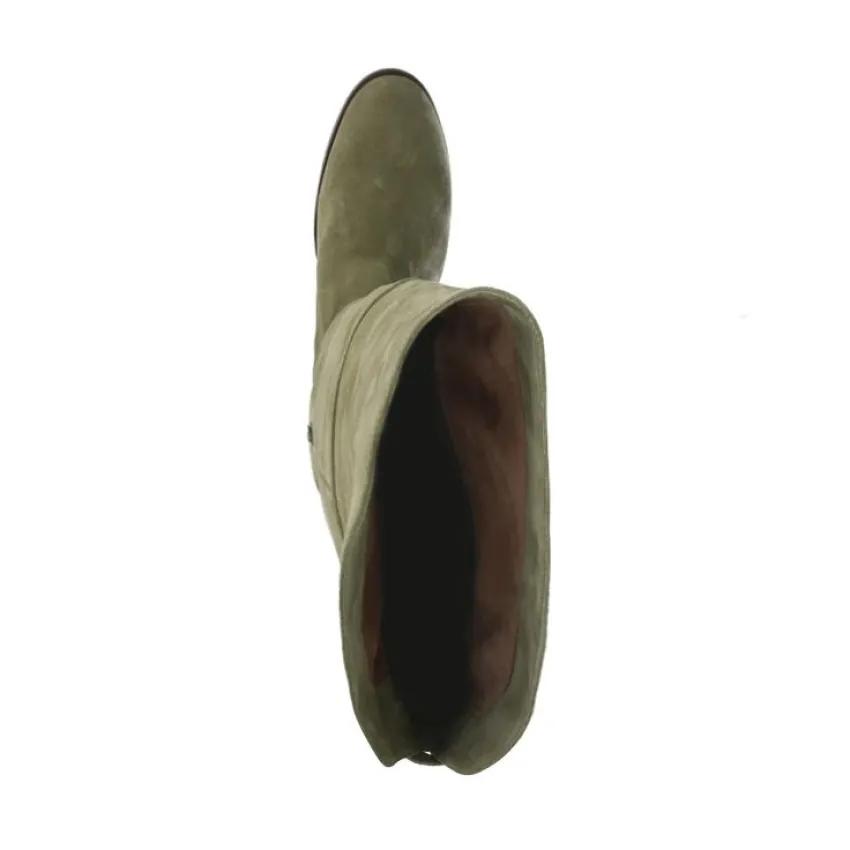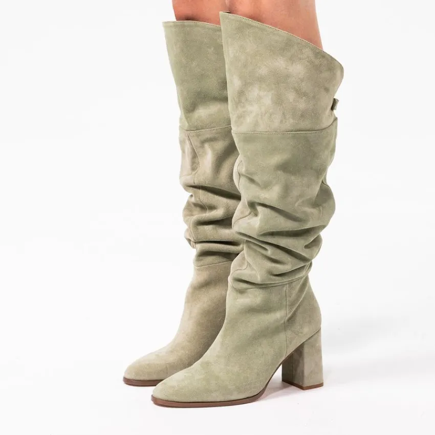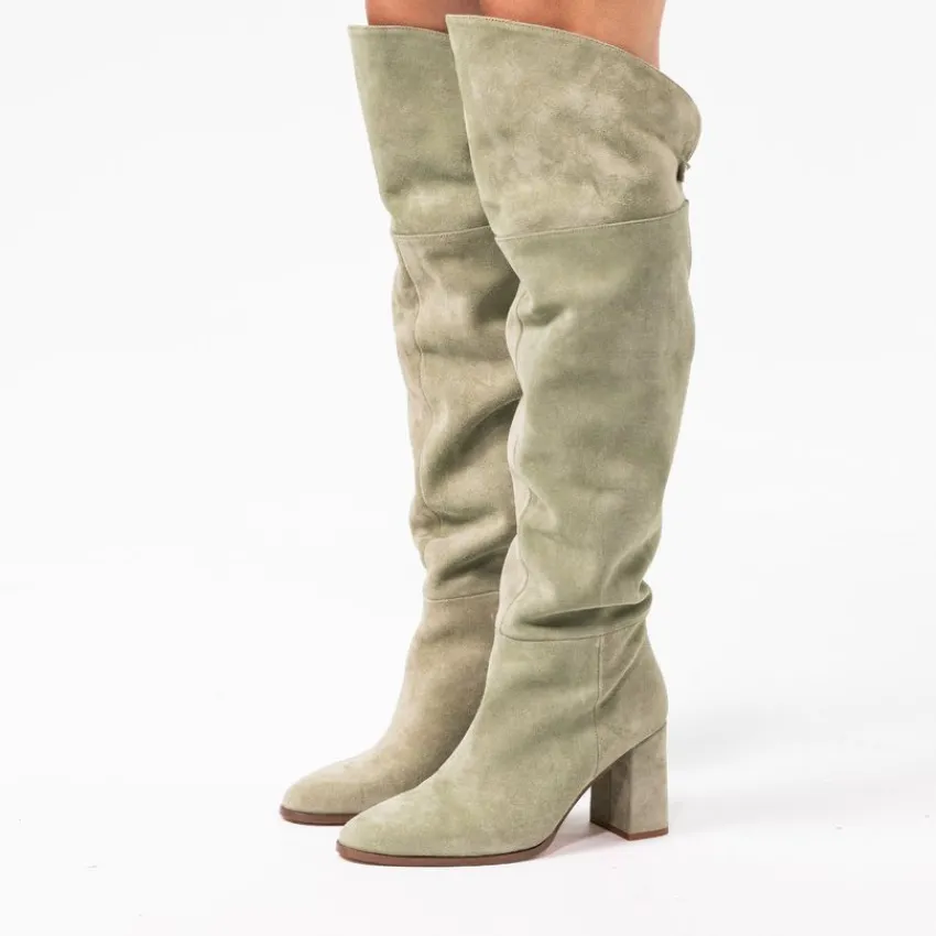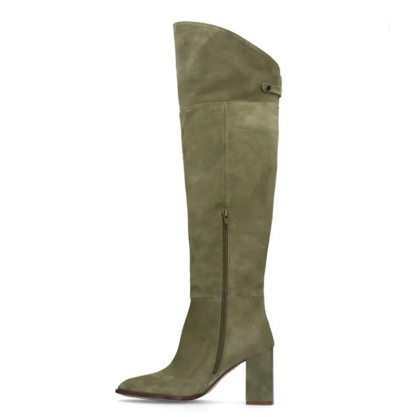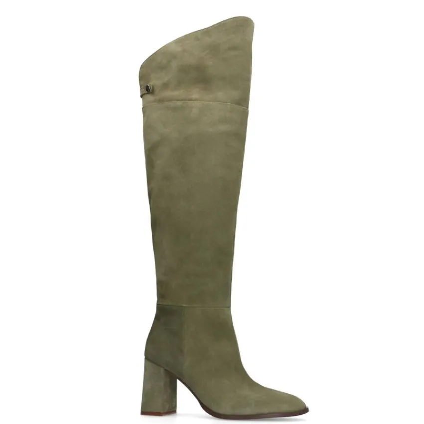Groene suède hoge laarzen met hak van Manfield. De laarzen hebben een hakhoogte van 8 cm en ritssluiting aan de binnenzijde. De laarzen hebben een schacht omtrek van 40 cm, een schacht hoogte aan de voorkant van 53 cm een schacht hoogte aan de achterkant van 43 cm en een ronde neus. We adviseren als verzorging en bescherming de suède/nubuck spray in transparant.