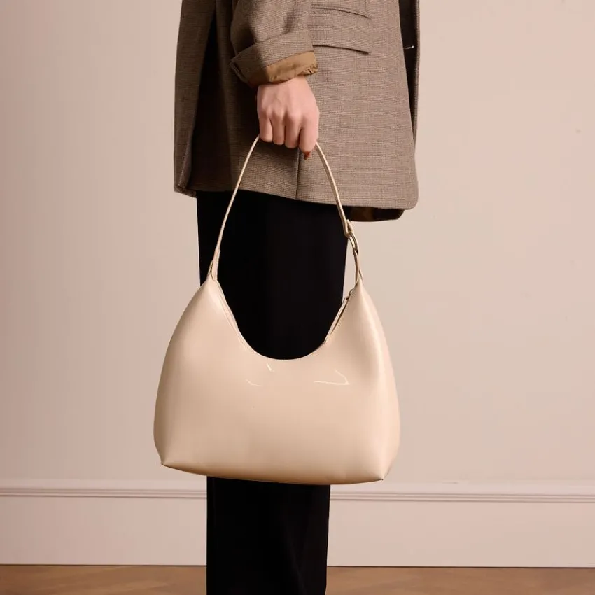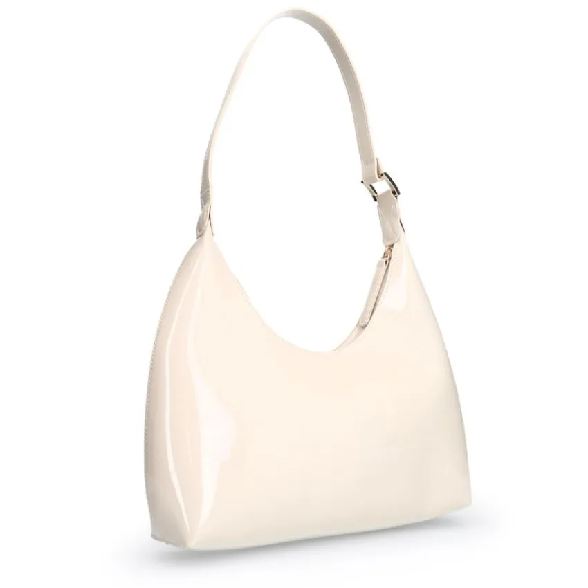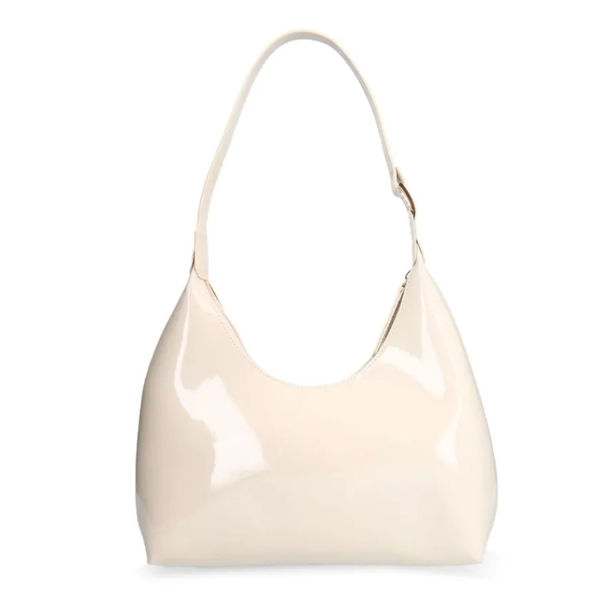Beige lak handtas van Manfield met ritssluiting. De afmeting van deze tas is 36x17x7 cm (BxHxD).