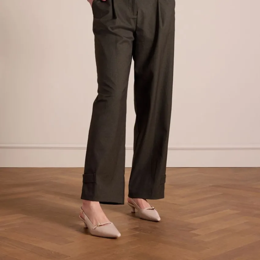 Beige lak slingbacks van Manfield met een hak van 5 cm, gespsluiting rondom de enkels en als detail over de voorvoet. We adviseren als verzorging en bescherming de Collonil Carbon Pro.