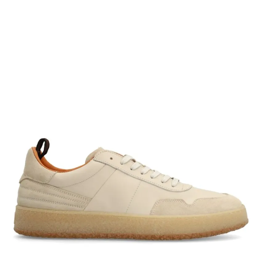 Beige leren sneakers met suède details van Manfield. De sneakers hebben een rubberen zool van 3 cm en we adviseren als bescherming en verzorging de Collonil Carbon pro.