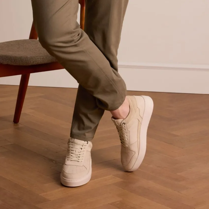 Beige nubuck sneakers van Manfield met witte zool van 3 cm. We adviseren als verzorging en bescherming de suède/nubuck spray in transparant.