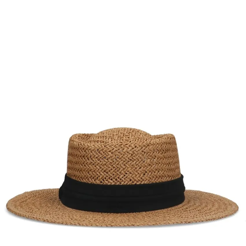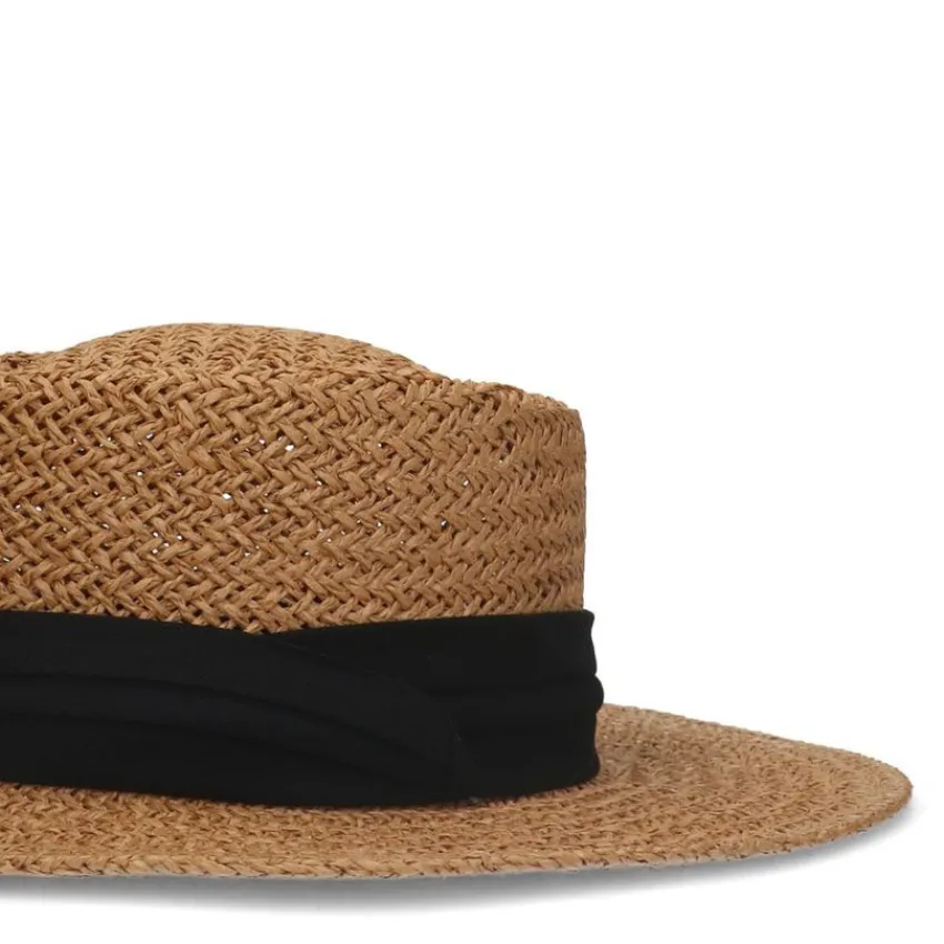 Beige raffia hoed met zwarte band van Manfield. De binnenkant kan aangetrokken worden met 2 touwtjes waardoor de hoed goed blijft zitten.