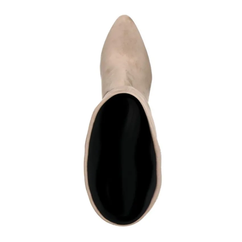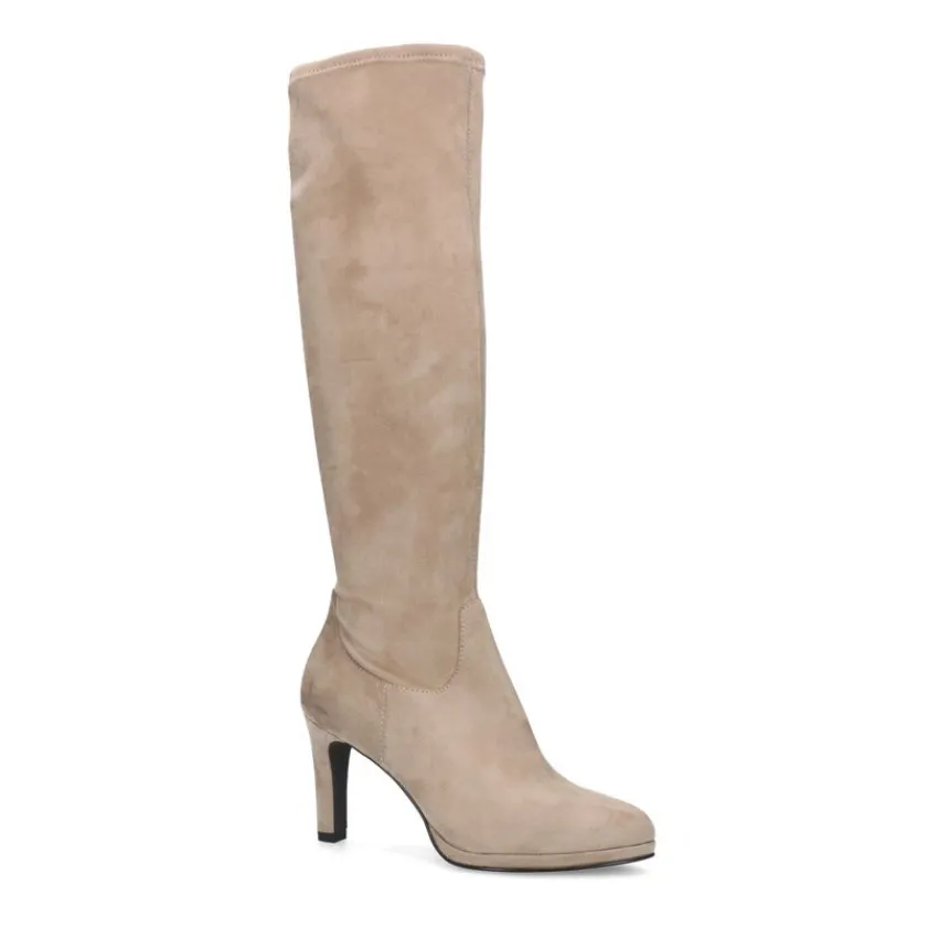 Beige suède stretch laarzen met hak van Manfield. De laarzen hebben een ritssluiting aan de binnenzijde. een hakhoogte van 9 cm en hebben een puntige neus. De schachthoogte is 45 cm en de schachtbreedte is 42 cm, gemeten bij een maat 37. We adviseren als verzorging en bescherming de suède/nubuck spray in transparant.