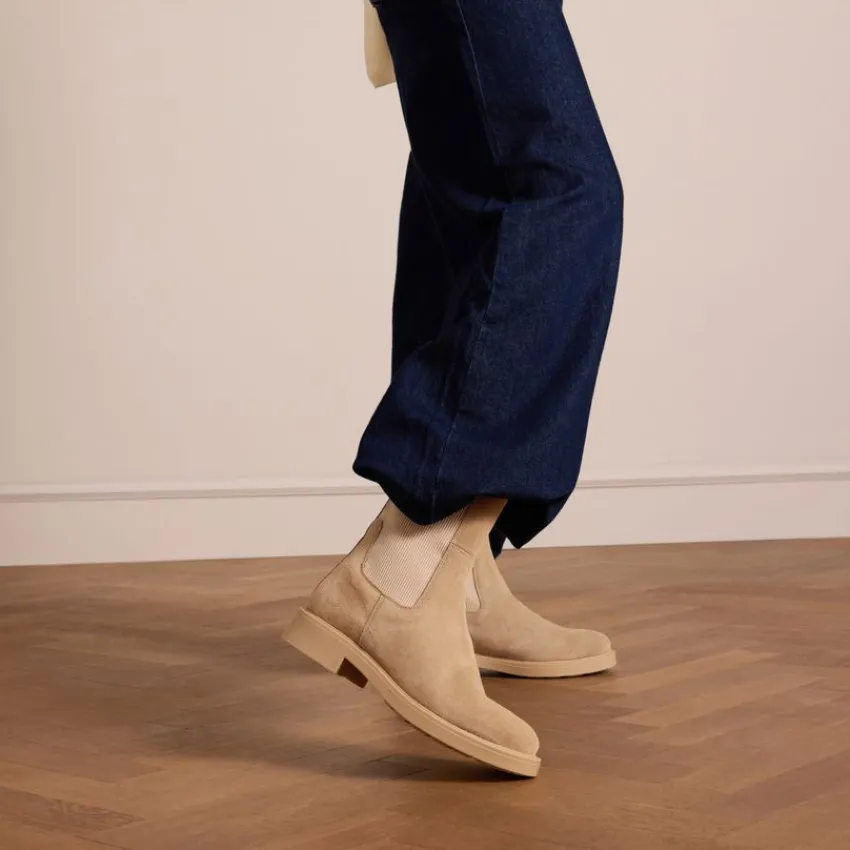 Beige suède chelsea boots van Manfield met platte hak van 3 cm, plateauzool van 2 cm en elastieken sluiting, We adviseren als verzorging en bescherming de suède/nubuck spray in transparant.