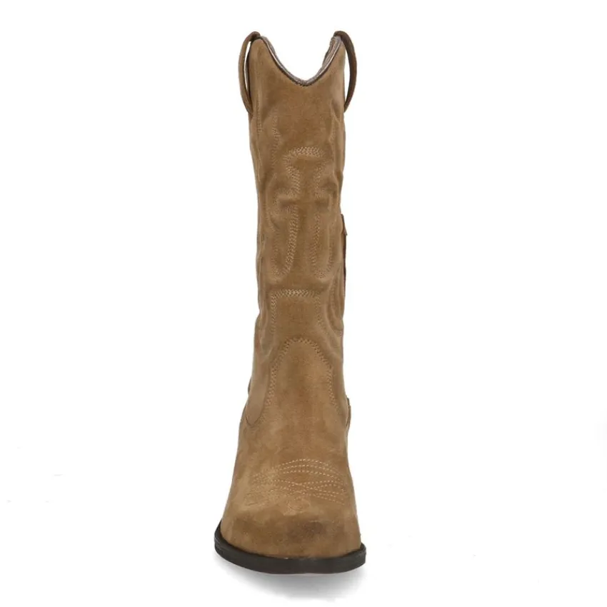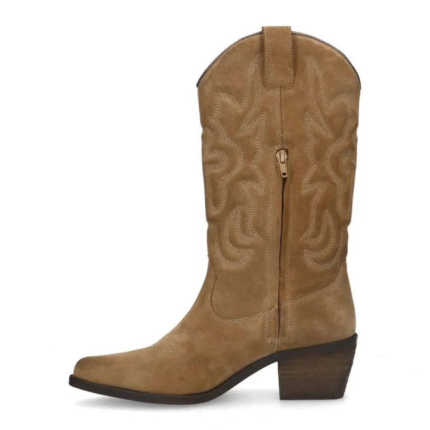 Beige suède cowboy laarzen van Manfield met blokhak van 5 cm en puntige neus. De laarzen hebben een schachthoogte van 30 cm en een schachtomtrek van 34 cm. We adviseren als verzorging en bescherming de suède/nubuck spray in transparant.