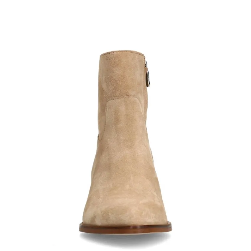 Beige suède enkellaarsjes met hak van Manfield. De enkellaarsjes hebben een rits aan de binnenzijde en een schuin afgesneden blokhak van 5 cm. We adviseren als verzorging en bescherming de suède/nubuck spray in transparant.
