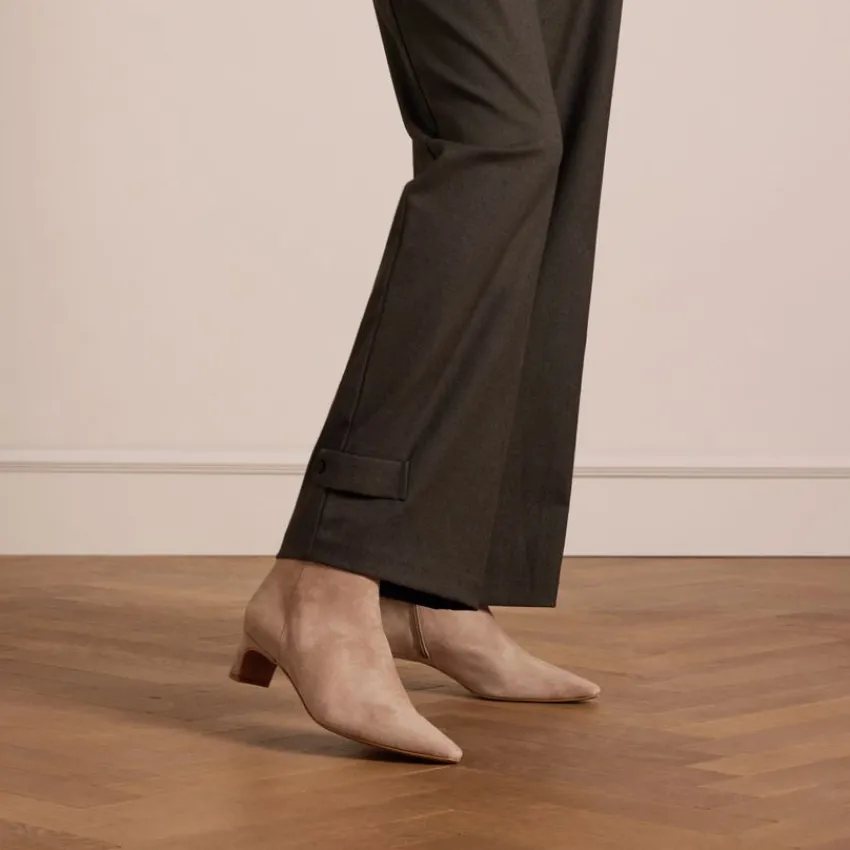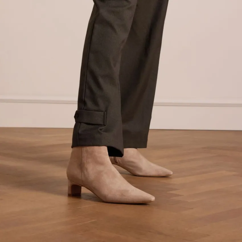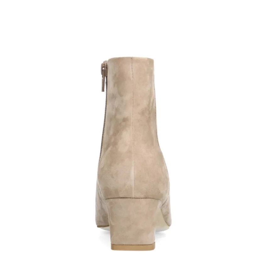 Beige suède enkellaarsjes met hak van Manfield. De laarsjes hebben een lage hak van 4 cm, puntige neus en ritssluiting aan de binnenzijde. We adviseren als verzorging en bescherming de suède/nubuck spray in transparant.