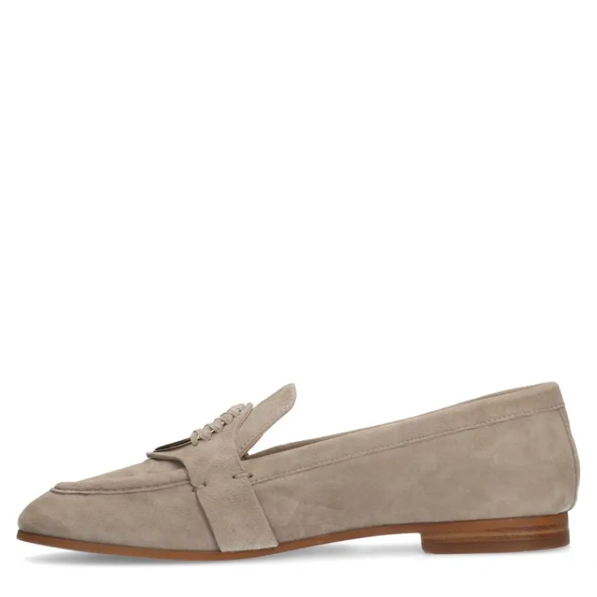 Beige suède loafers van Manfield met platte hak van 1 cm en goudkleurig detail op de voorvoet. We adviseren als verzorging en bescherming de suède/nubuck spray in transparant.