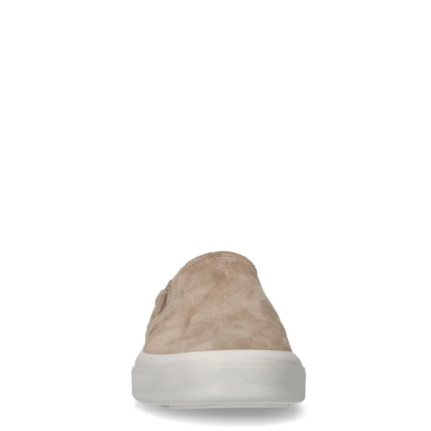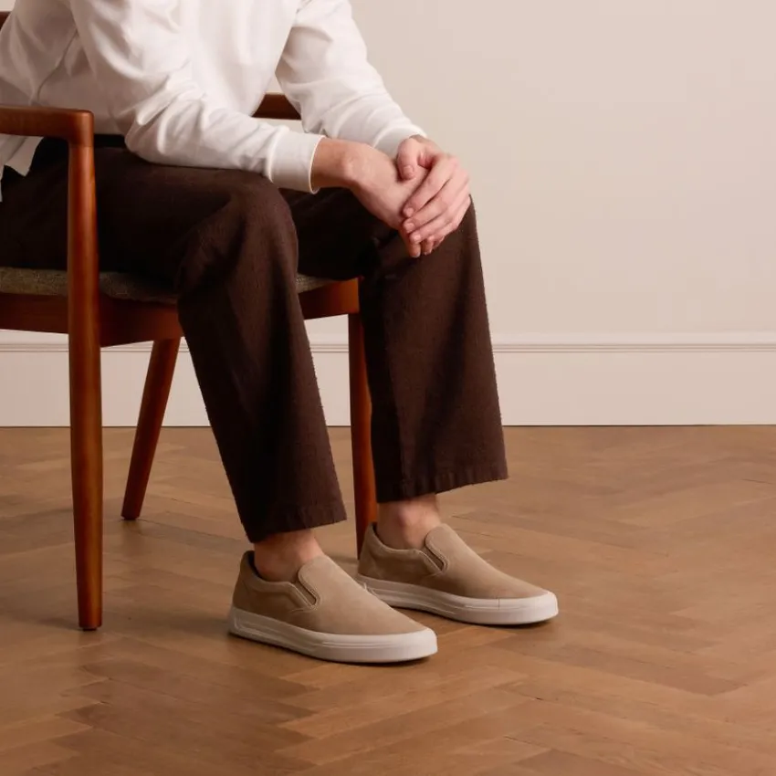 Beige suède loafers van Manfield met een witte zool van 3 cm en uitneembare binnenzool. We adviseren als verzorging en bescherming suède/nubuck spray in transparant.