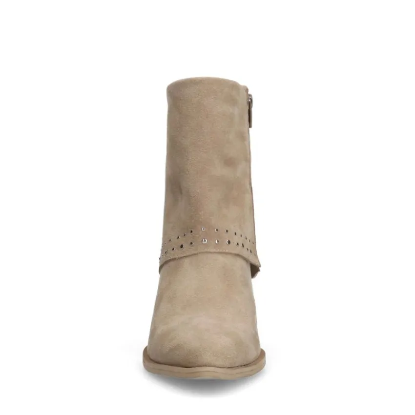 Beige suède overslaglaars met gouden studs van Manfield. De laars heeft een hak van 6 cm en puntige neus. We adviseren als verzorging en bescherming de suède/nubuck spray in transparant.