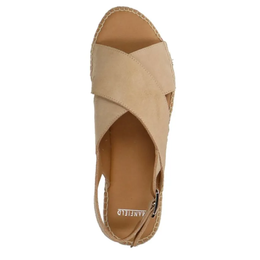 Beige suède sandalen met plateau van Manfield, De plateauzool is 3 cm en heeft een gespsluiting. We adviseren als verzorging en bescherming de suède/nubuck spray in transparant.