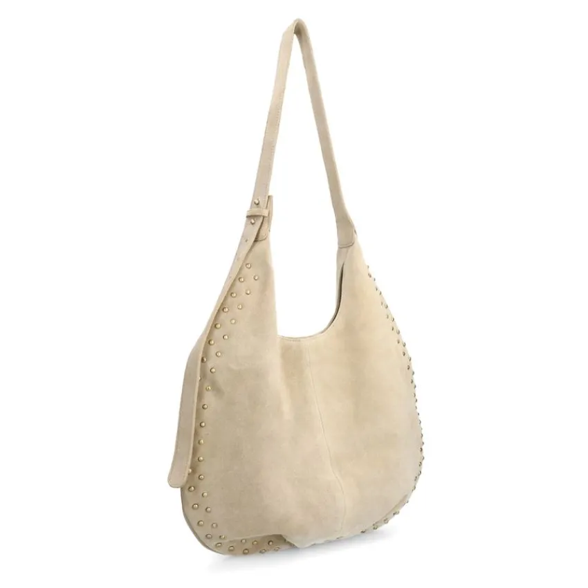 Beige suède schoudertas met studs van Manfield. De tas heeft een drukknoopsluiting en de afmeting is 43x31x5 cm (BxHxD).
