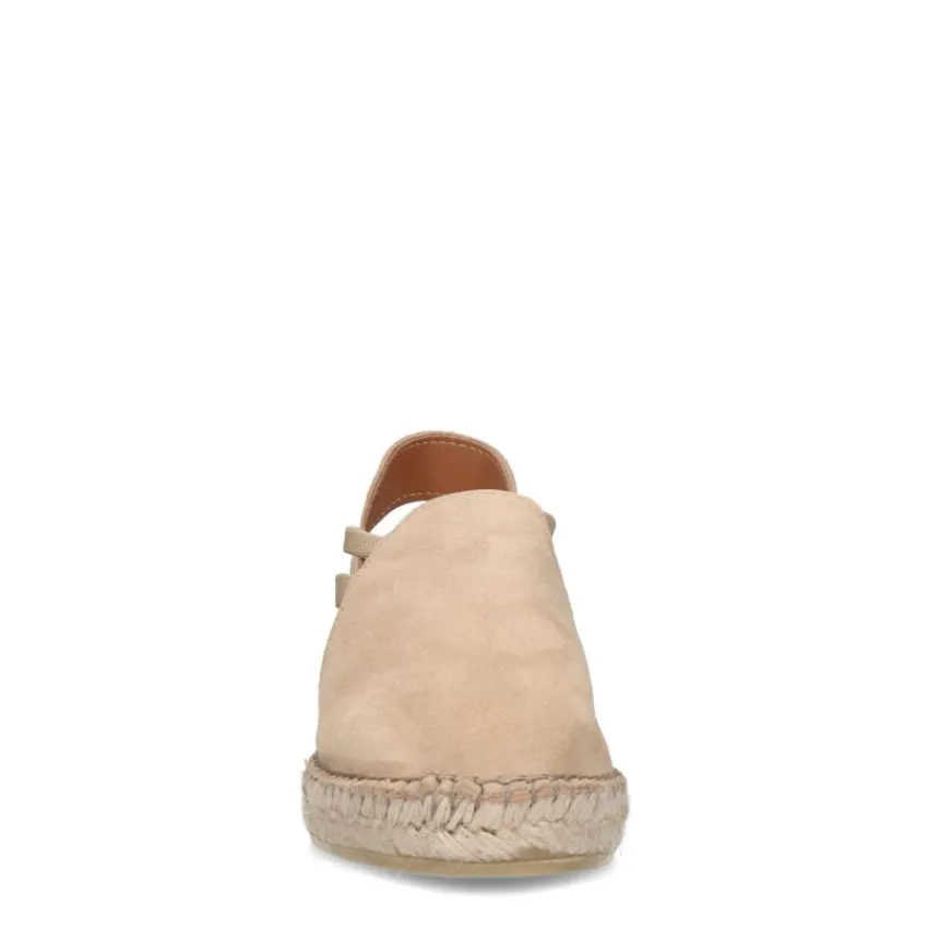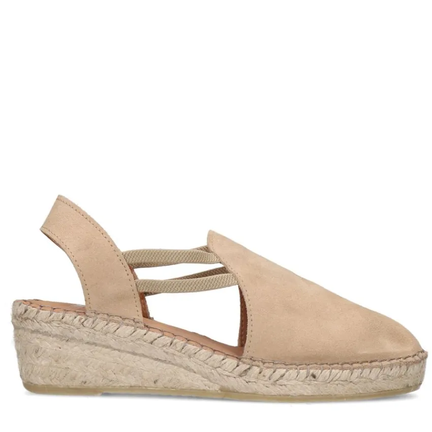 Beige suède sandalen met sleehak van Manfield. De sandalen hebben een elastiek sluiting en hak van 4 cm. We adviseren als verzorging en bescherming de suède/nubuck spray in transparant.