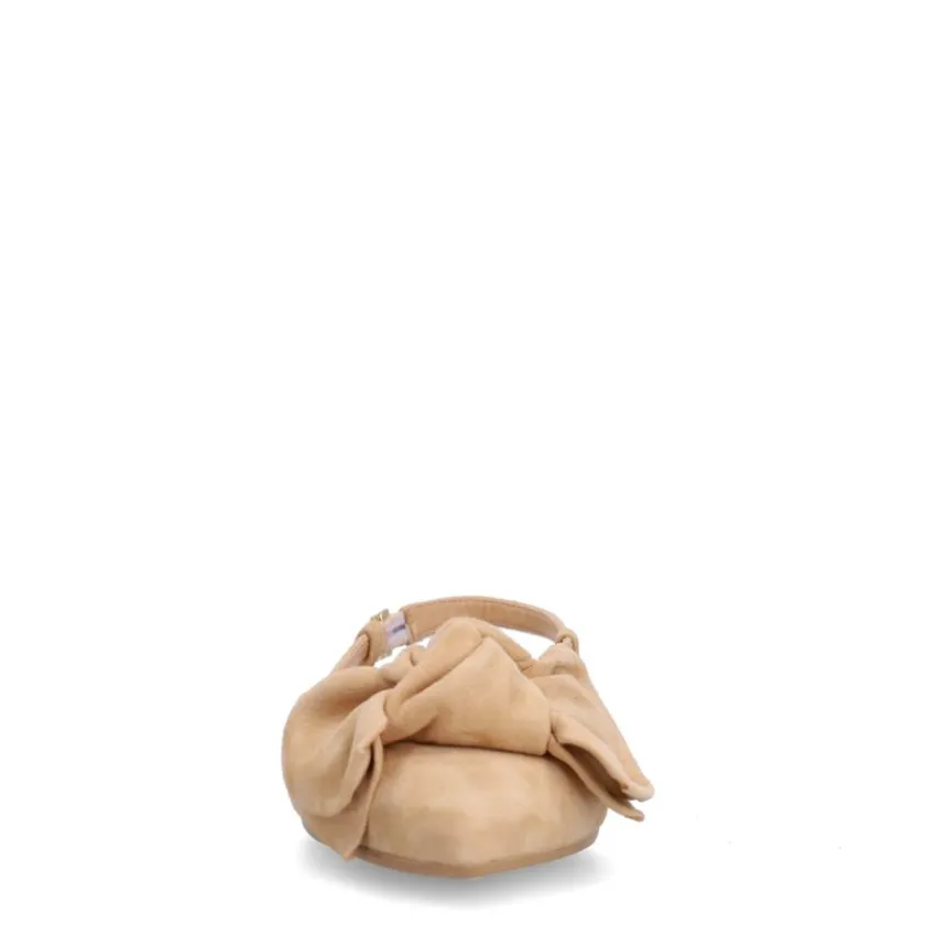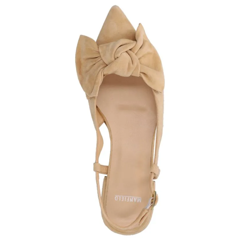 Beige suède slingbacks van Manfield met puntige neus met strik erop, gespsluiting rondom de enkels en een platte hak van 2 cm. We adviseren als verzorging en bescherming de suède/nubuck spray in transparant.