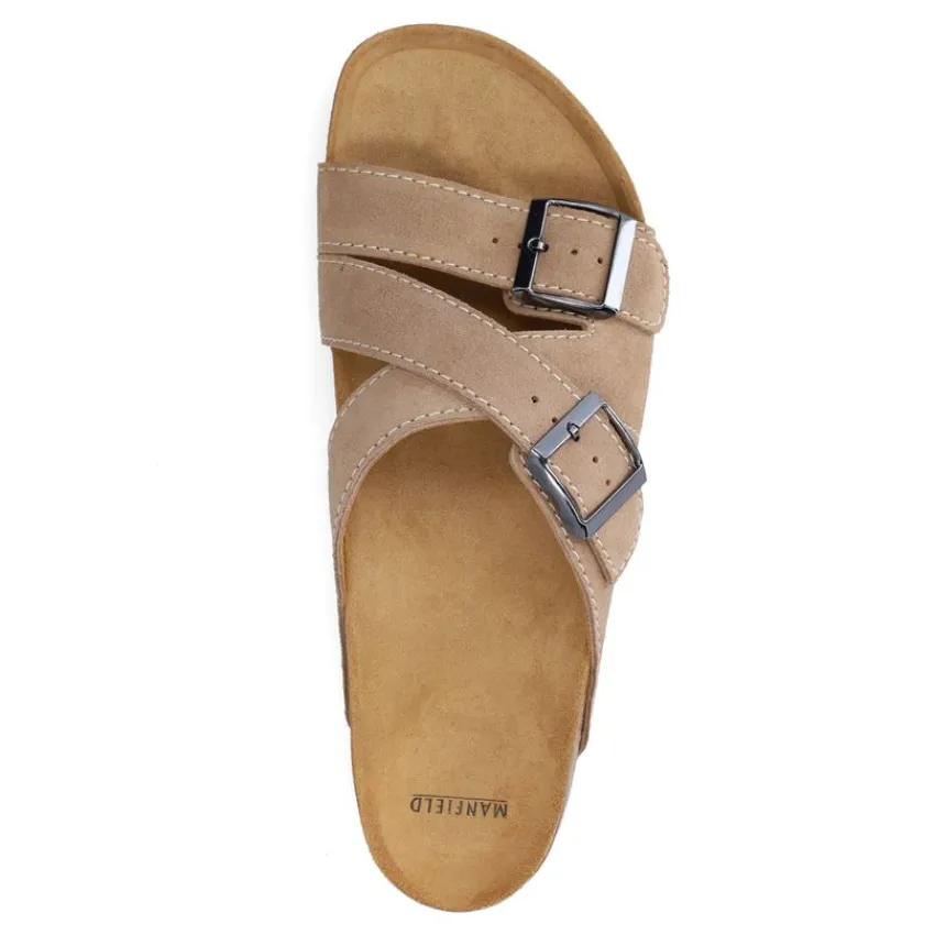 Beige suède slippers van Manfield met gekruiste banden en gesp die over de voorvoet lopen. We adviseren als verzorging en bescherming de suède/nubuck spray in transparant.