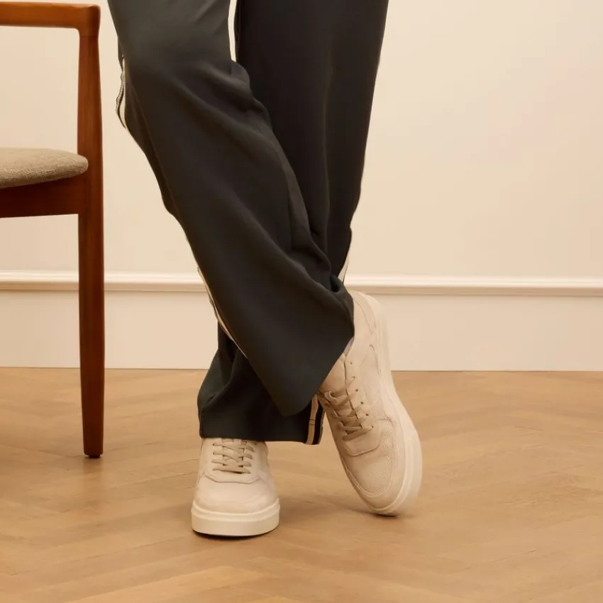 Beige suède sneakers van Manfield met vetersluiting en plateauzool van 4 cm. De binnenzool is uitneembaar en we adviseren als verzorging en bescherming de suède/nubuck spray in transparant.