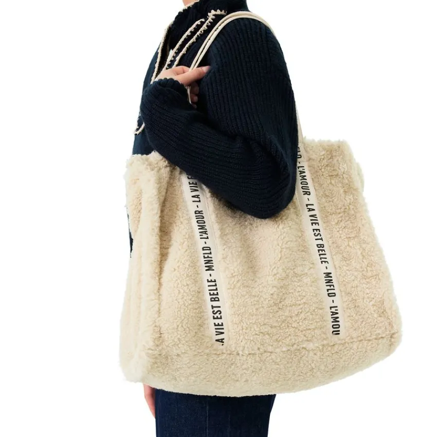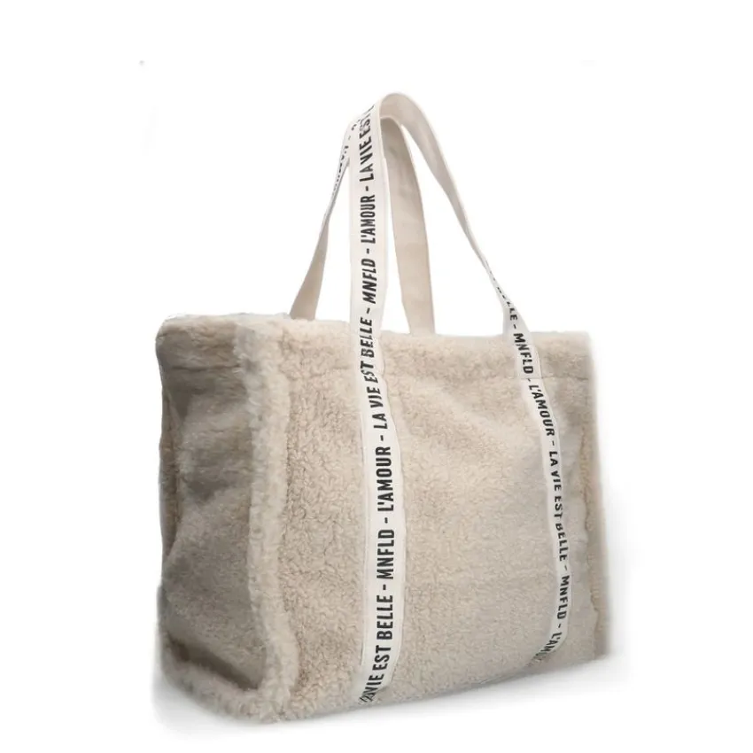 Beige teddy shopper van Manfield. De afmeting van deze tas is 43x36x19 cm (BxHxD). De tas is voorzien van een goudkleurige ritssluiting en een verstelbare beige strap waardoor je hem op meerdere manieren kan dragen.