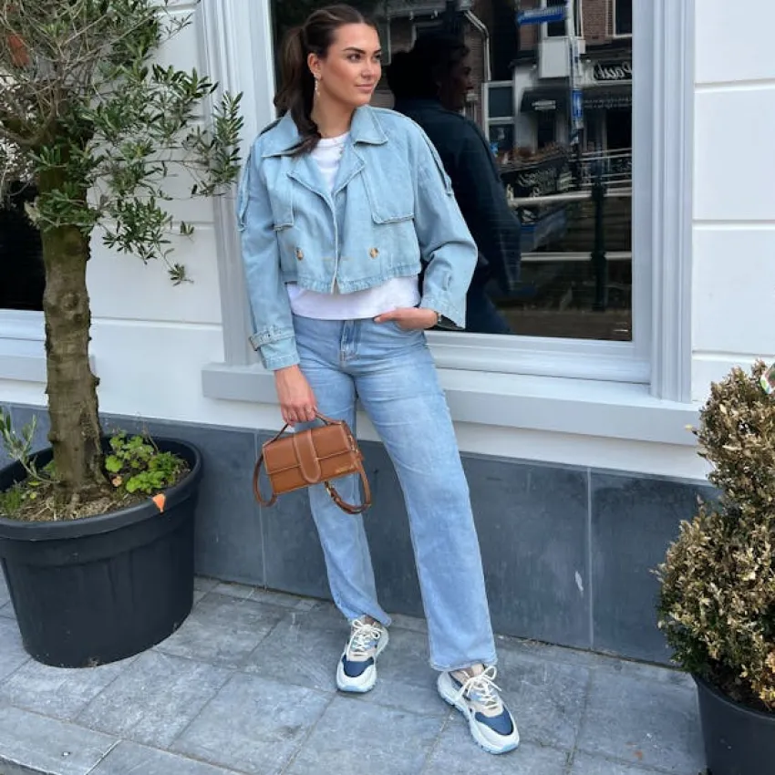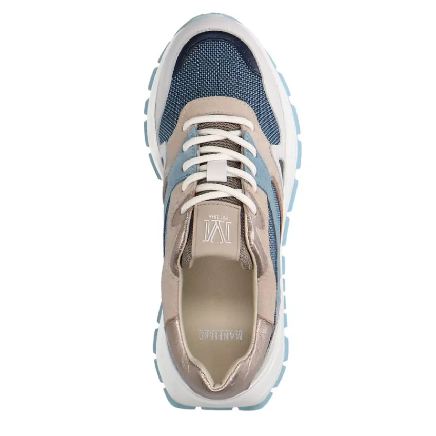 Blauwe denim sneakers van Manfield. Deze sneakers zijn aan de buitenkant gemaakt van leer, suède en stof en aan de binnenkant van leer. Deze sneakers zijn voorzien van een vetersluiting en de zool heeft een hoogte van 4 cm. We adviseren als verzorging en bescherming de Natural Trendspray.