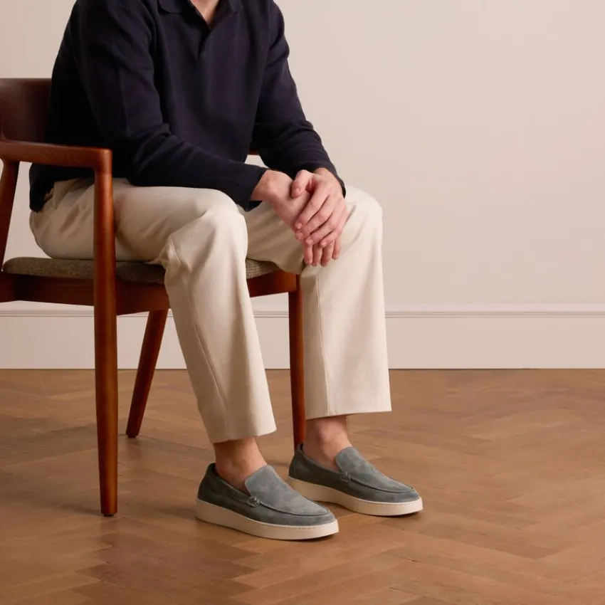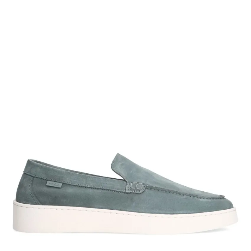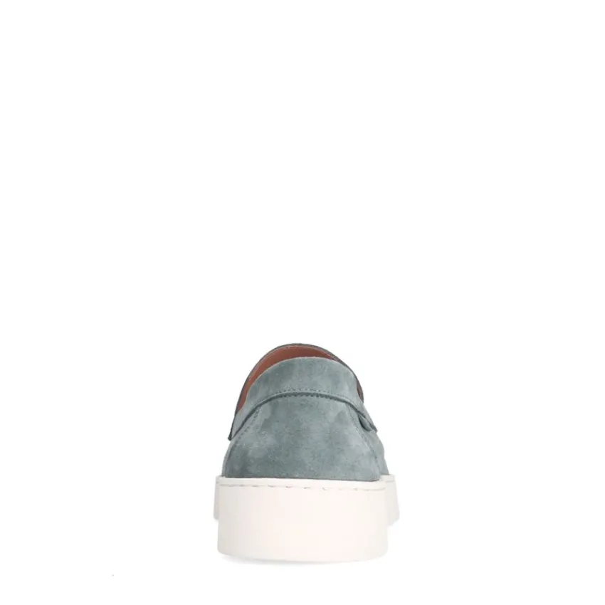 Blauwe suède loafers van Manfield met een witte zool van 3 cm. We adviseren als verzorging en bescherming suède/nubuck spray in transparant.