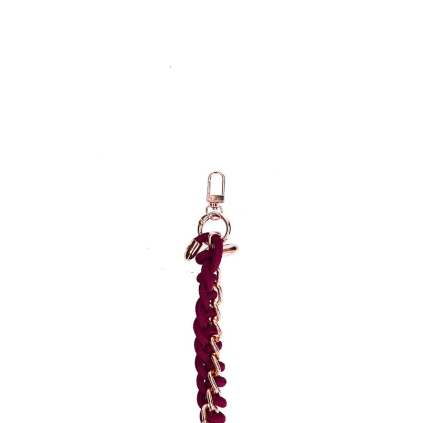 Bordeaux rode bag charm met gouden details van Manfield met klipsluiting. De tashanger heeft een lengte van 30 cm en is 2 cm breed.