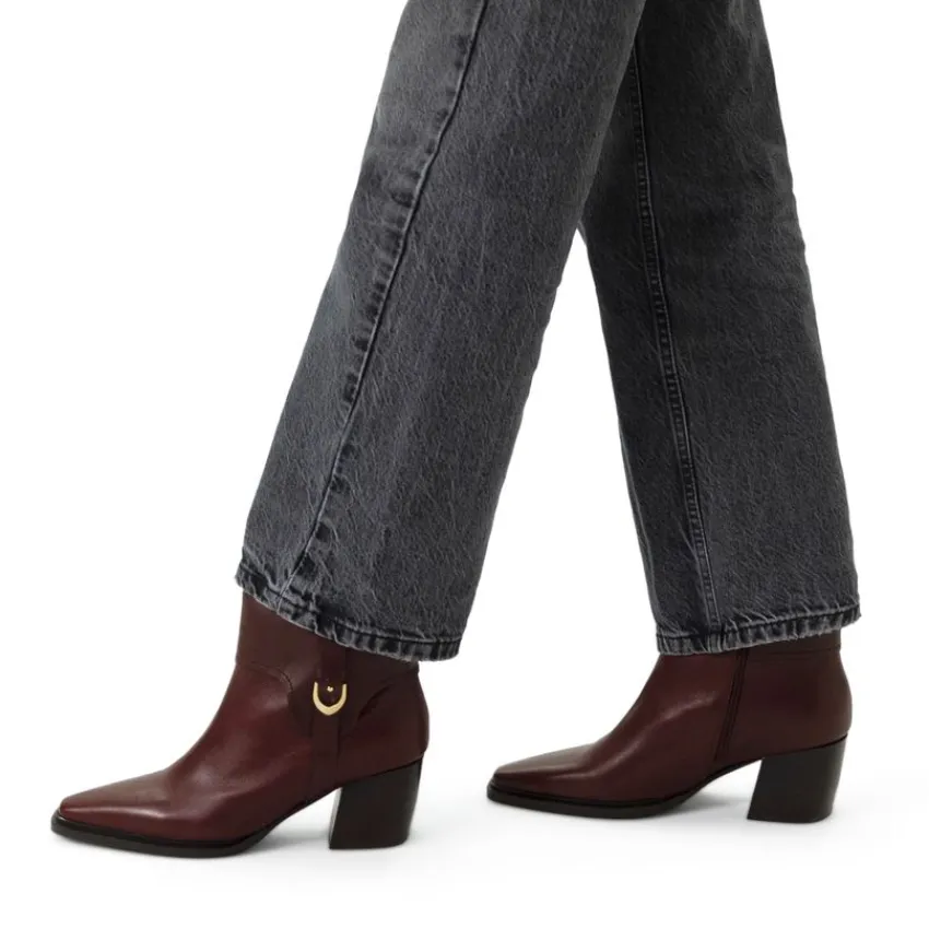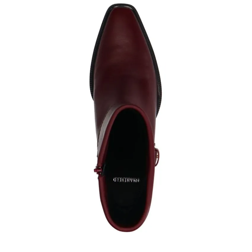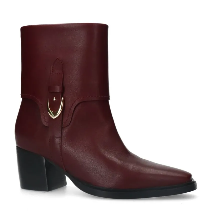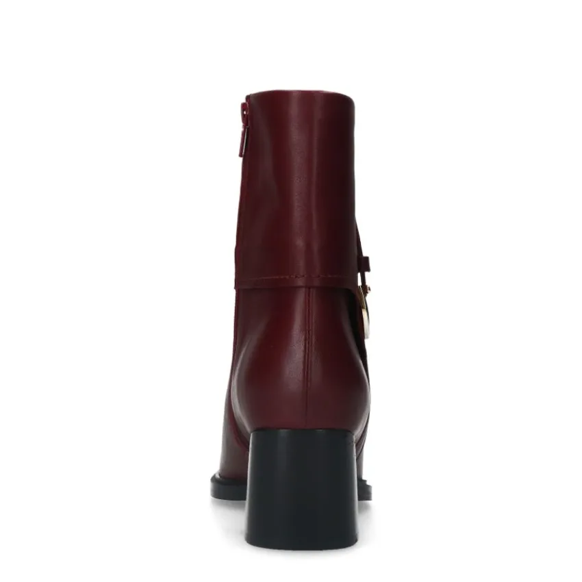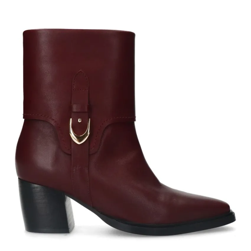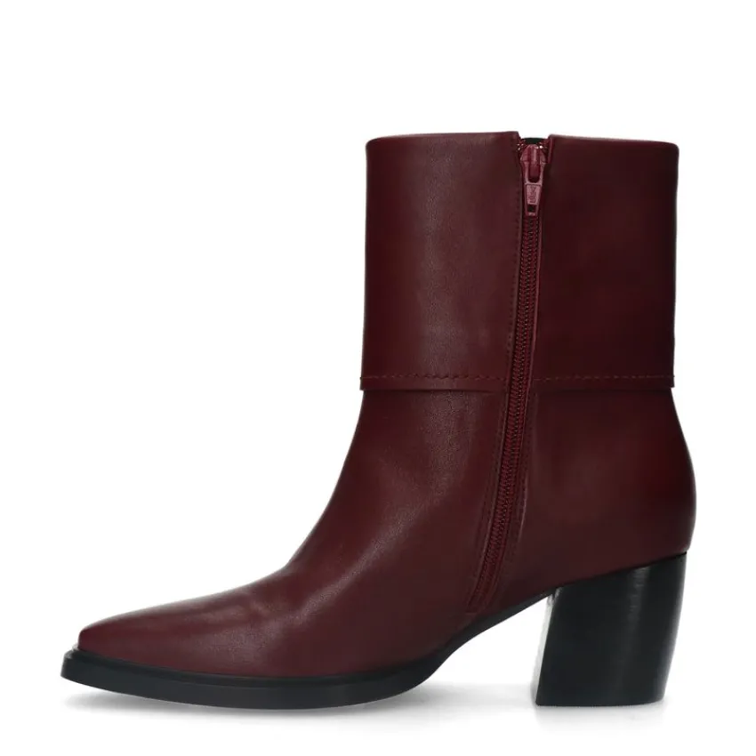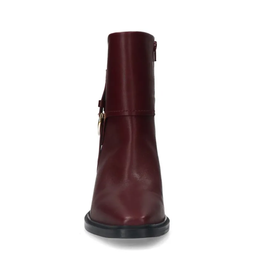 Bordeaux rode leren enkellaarsjes met hak van Manfield. De laarsjes hebben een blokhak van 6 cm, ritssluiting aan de binnenzijde en goud detail aan de zijkant. De schachthoogte is 17 cm en de schachtbreedte 31 cm, gemeten bij een maat 37. We adviseren als verzorging en bescherming de Collonil Carbon Pro.