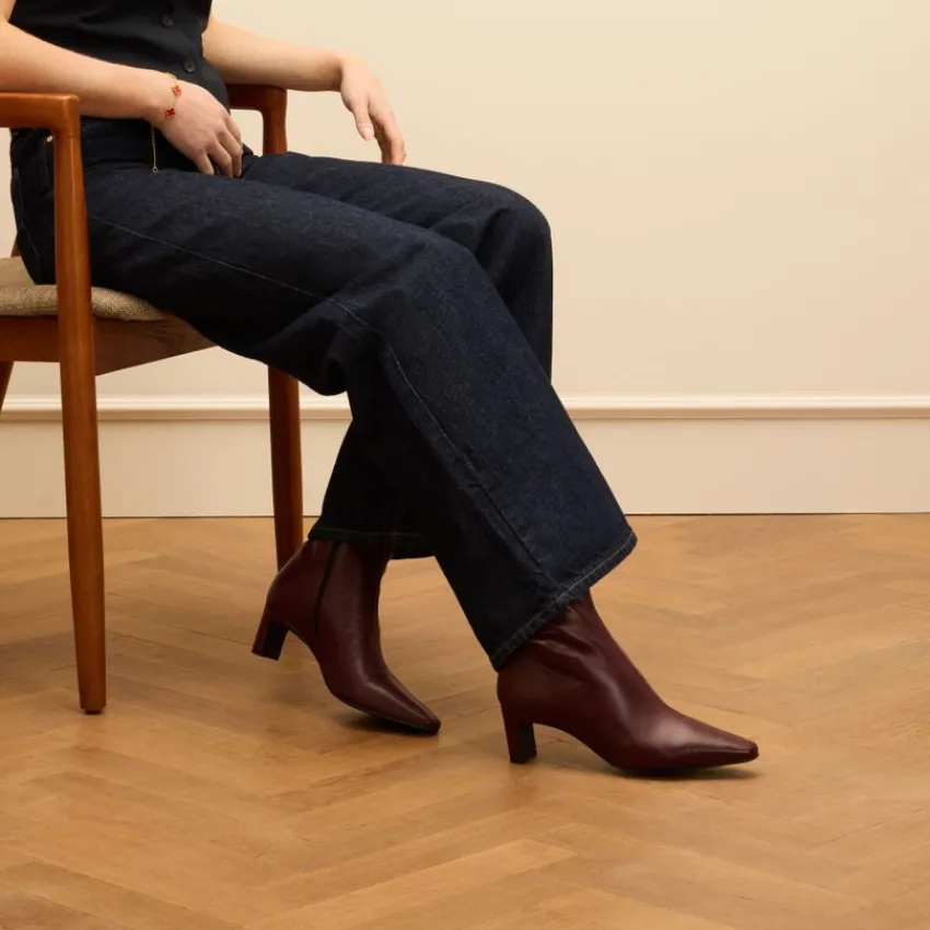 Bordeaux rode leren enkellaarsjes met hak van Manfield. De laarsjes hebben een lage hak van 5 cm, puntige neus en ritssluiting aan de binnenzijde. We adviseren als verzorging en bescherming de Collonil Carbon Pro.