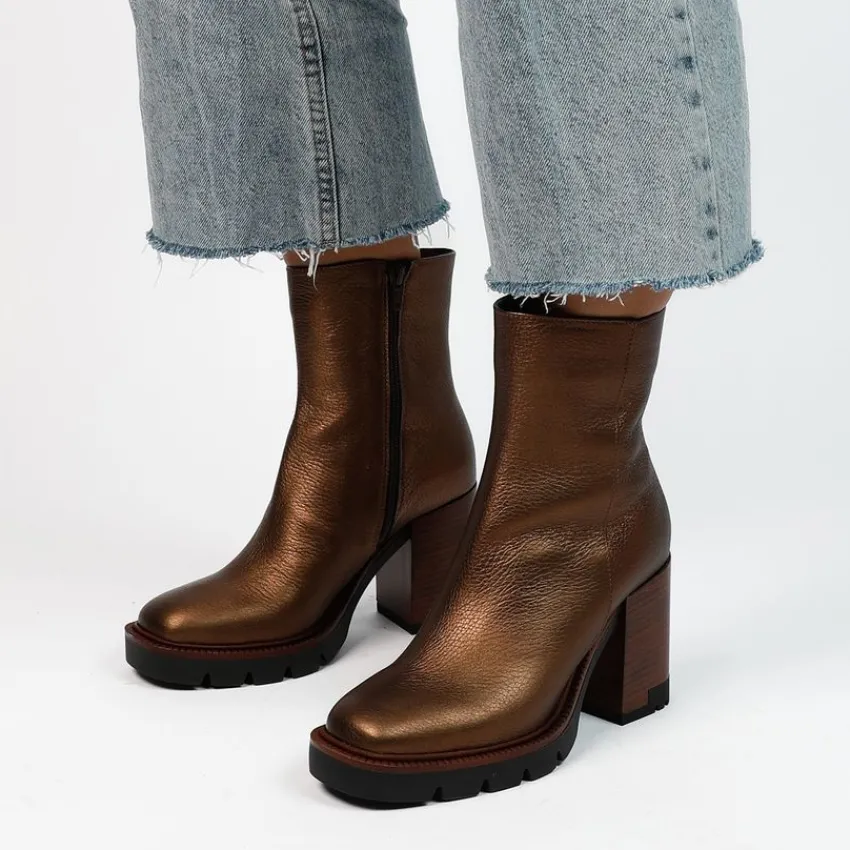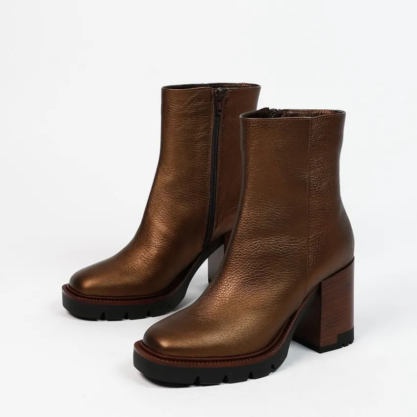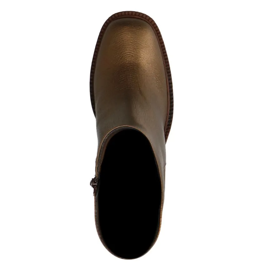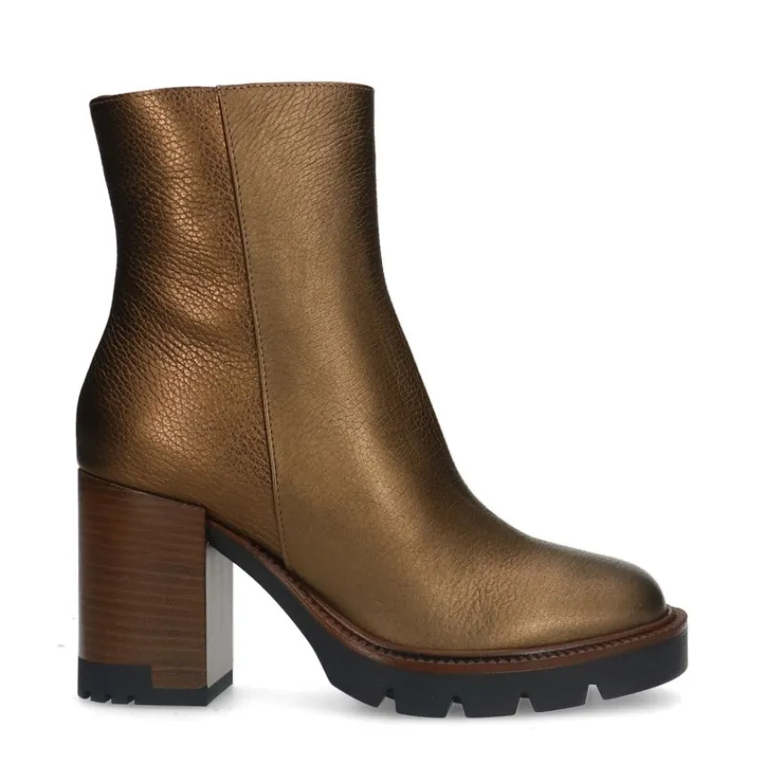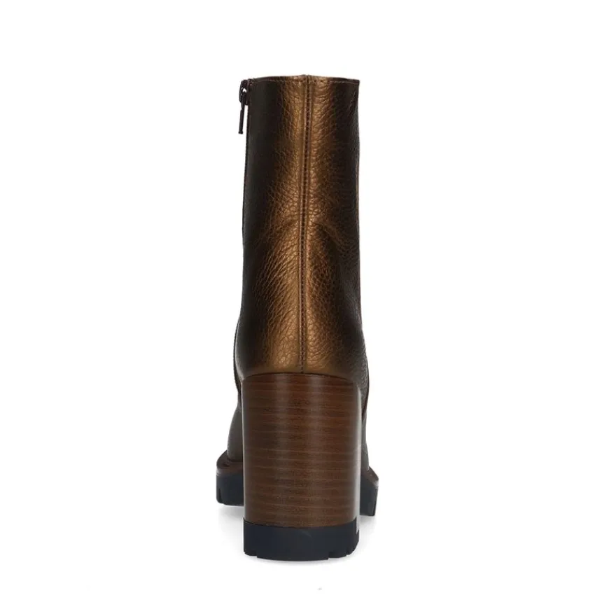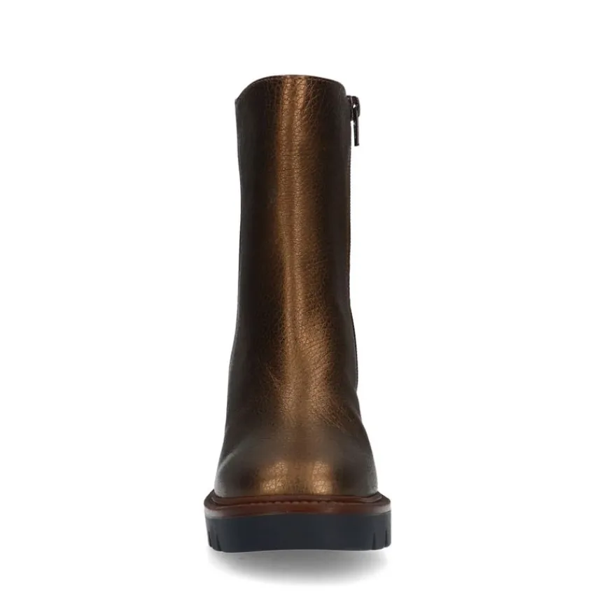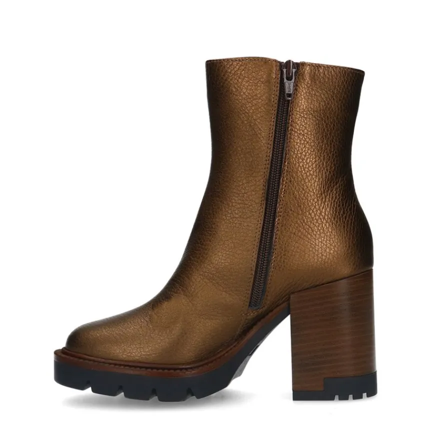Bronskleurige leren enkellaarsjes van Manfield. Deze laarsjes hebben een blokhak van circa 8 cm. Deze laarsjes zijn gemaakt van leer en daarom raden we je aan deze dames laarzen te verzorgen en beschermen met de Collonil Carbon Pro. Deze dames laarsjes kunnen gesloten worden doormiddel van een rits.