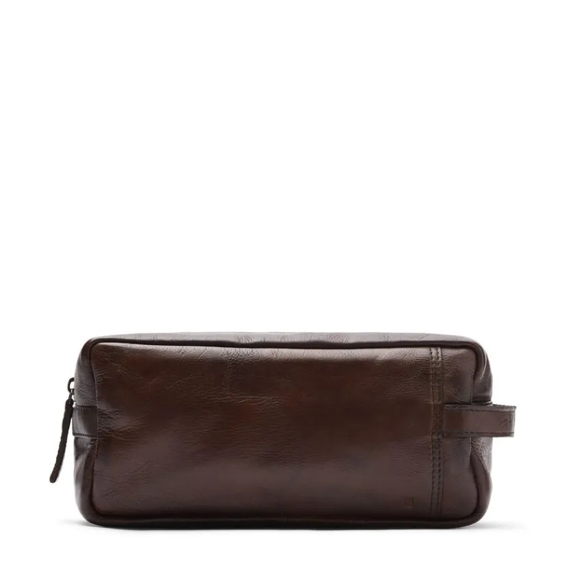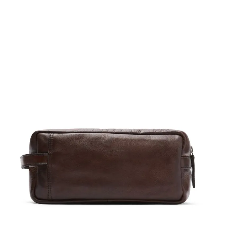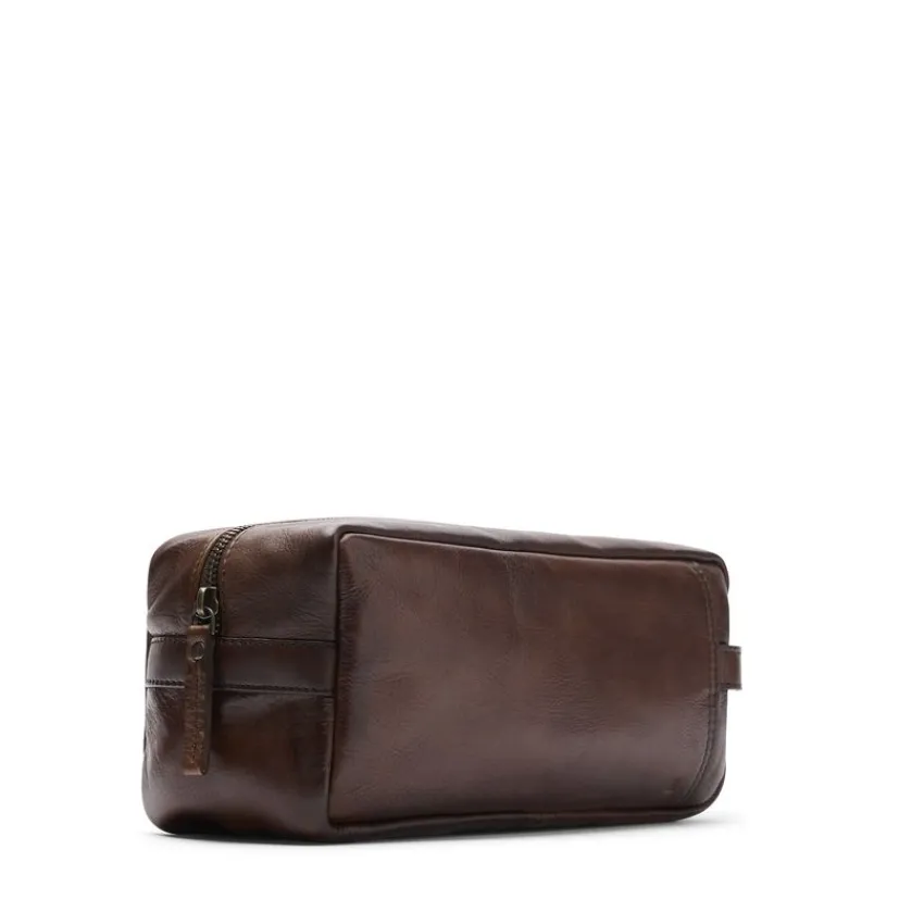 Bruine leren toilettas van Manfield met ritssluiting. De afmeting van de toilettas is 25x14x12 cm (BxHxD).