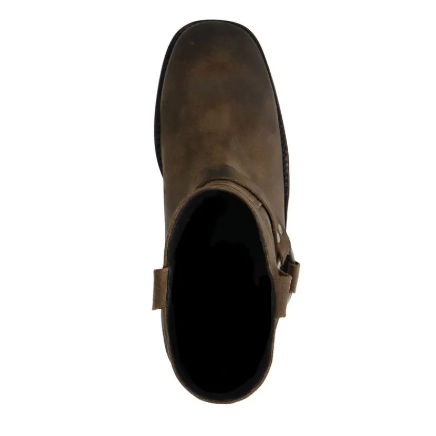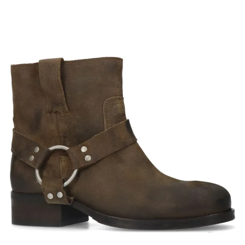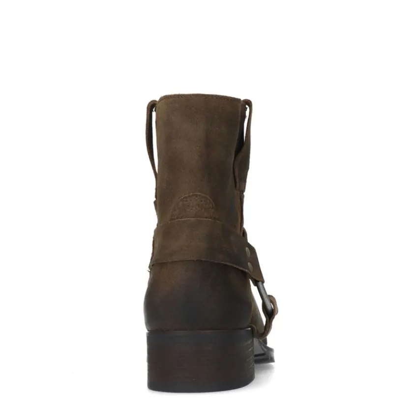Bruine suède biker boots van Manfield. Deze biker boots zijn gemaakt van suède en daarom raden we je aan deze dames boots te verzorgen en beschermen met de Collonil Carbon Pro. Deze boots zijn voorzien van zilverkleurige gespjes en zijn voorzien van een platte blokhak van 3 cm hoog.