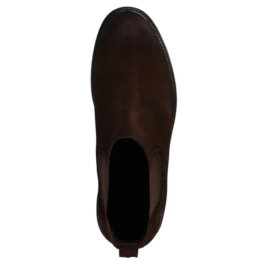Bruine suède chelsea boots van Manfield met een platte hak van 2 cm. We adviseren als verzorging en bescherming de suède/nubuck spray in transparant.
