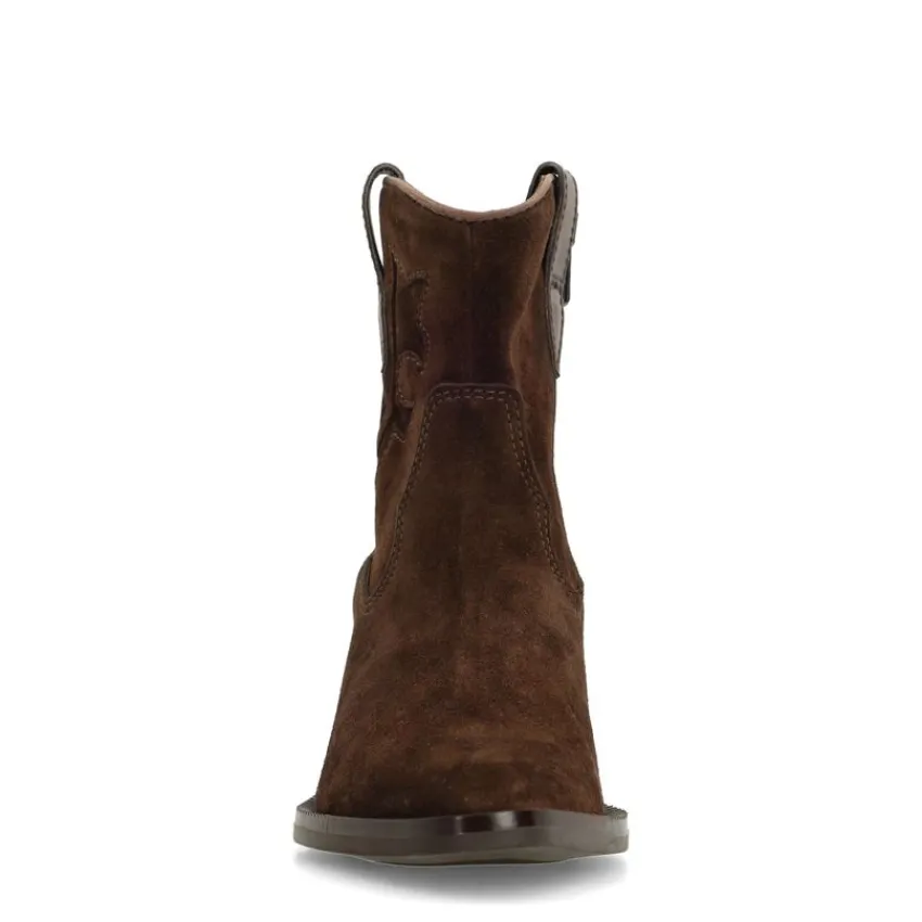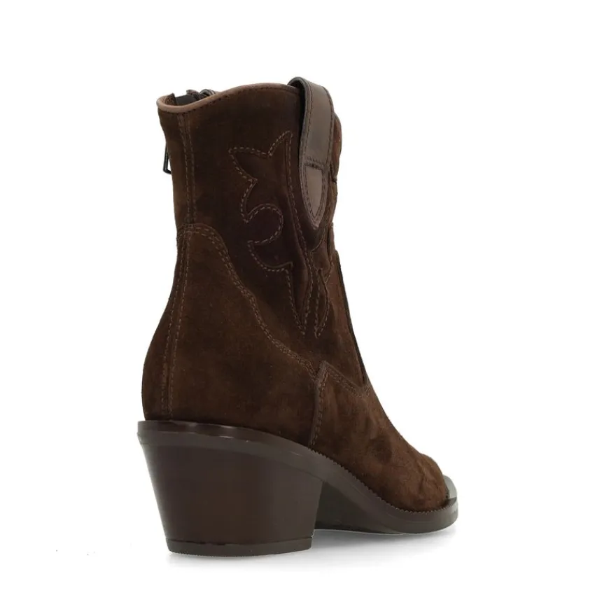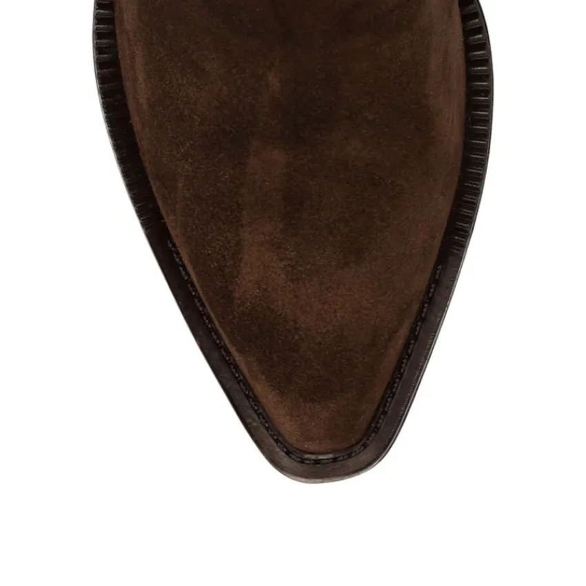 Bruine suède cowboy laarsjes van Manfield met een ritssluiting, puntige neus en blokhak van 5 cm. De laarsjes hebben stiksel details aan de zijkanten. We adviseren als verzorging en bescherming de suède/nubuck spray in transparant.