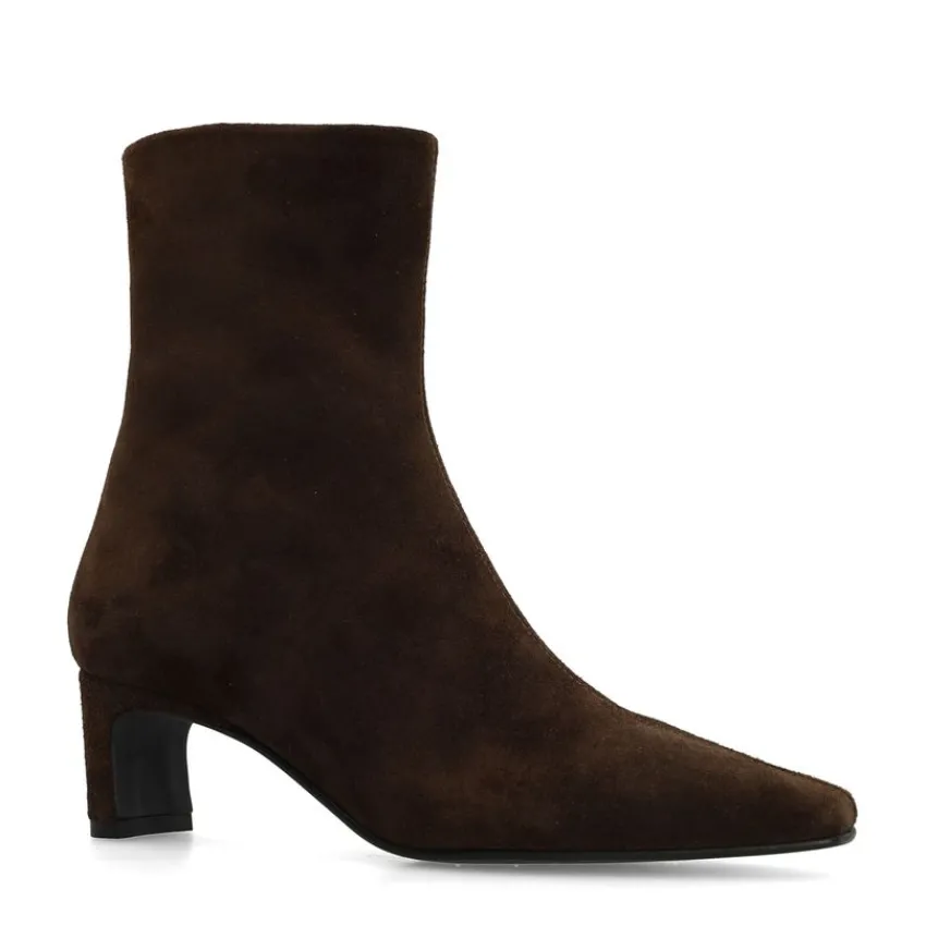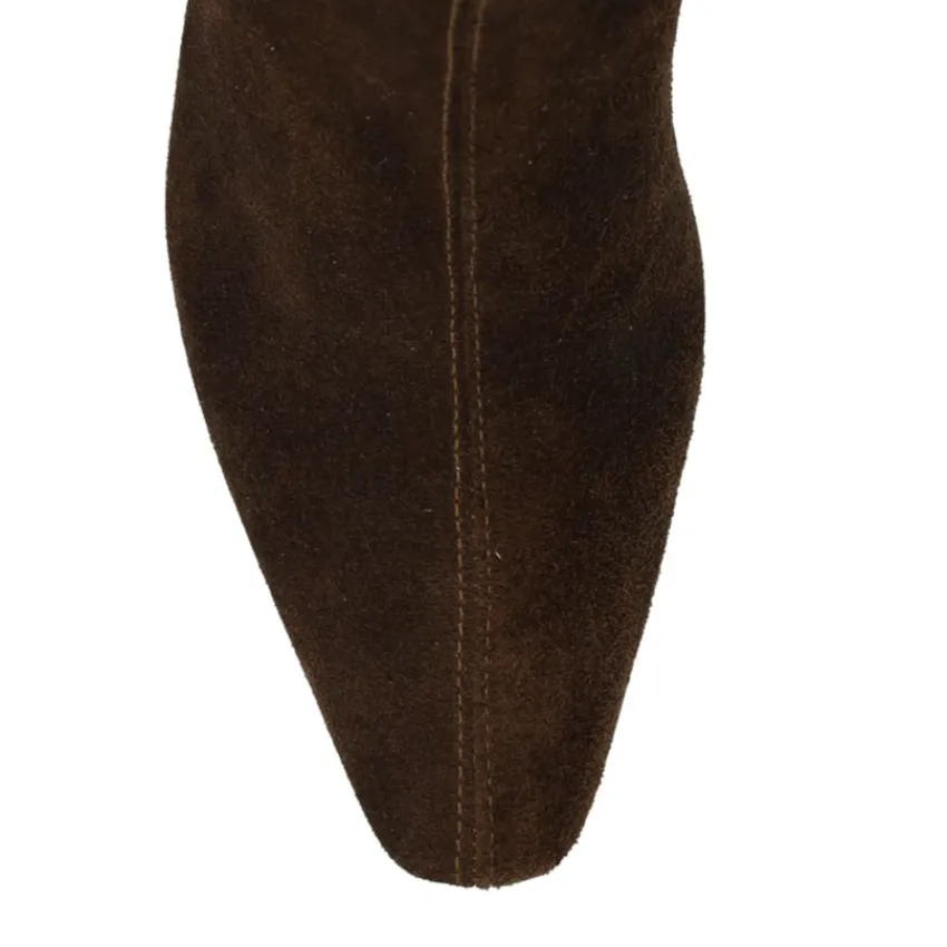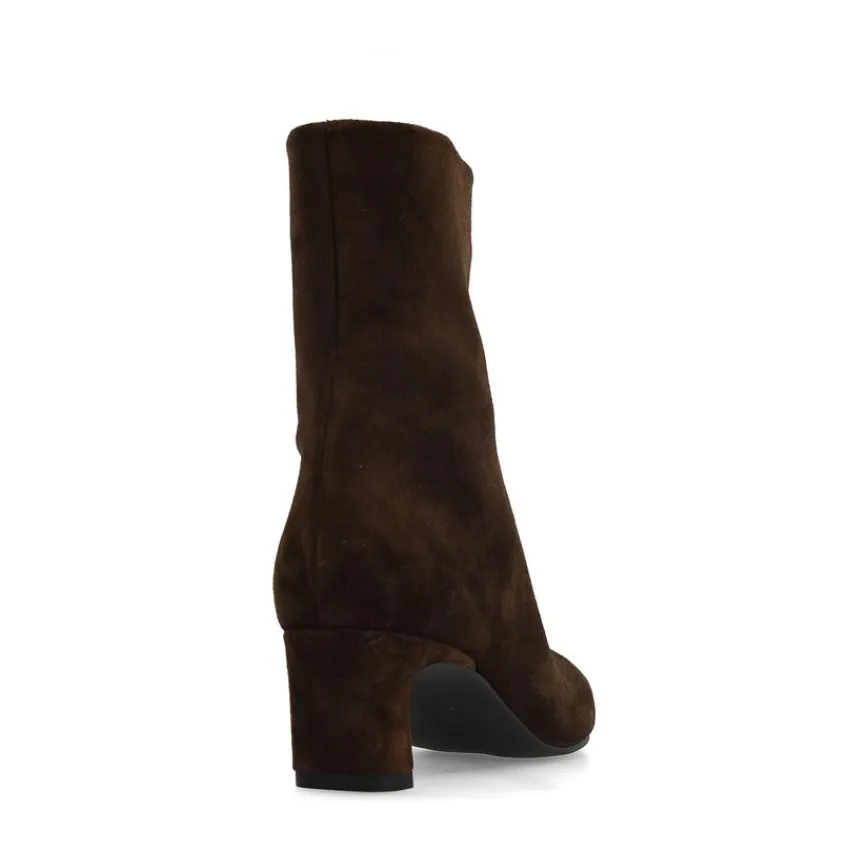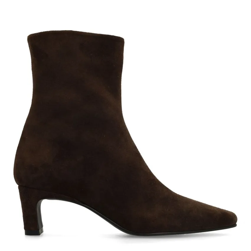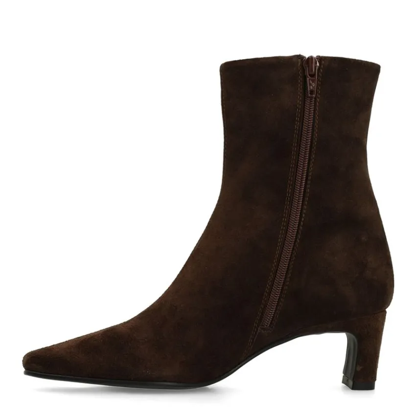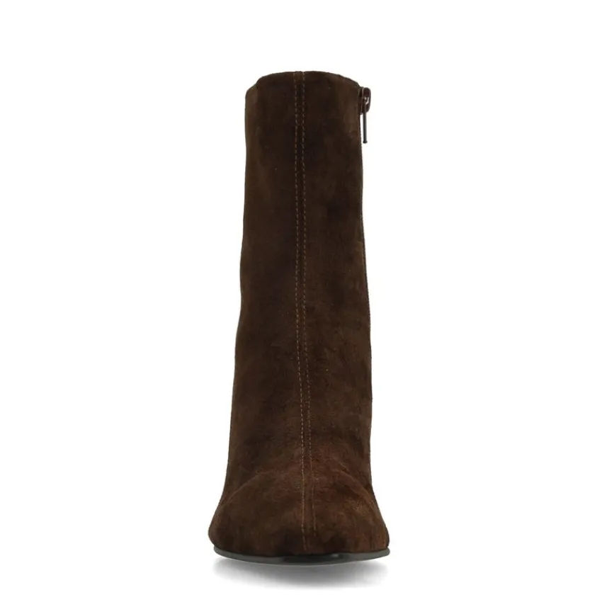 Bruine suède enkellaarsjes met hak van Manfield. De laarsjes hebben een ritssluiting aan de zijkant, een puntige neus en een hak van 4 cm. We adviseren als verzorging en bescherming de Natural Trendspray.
