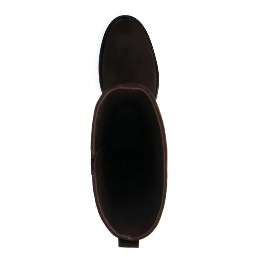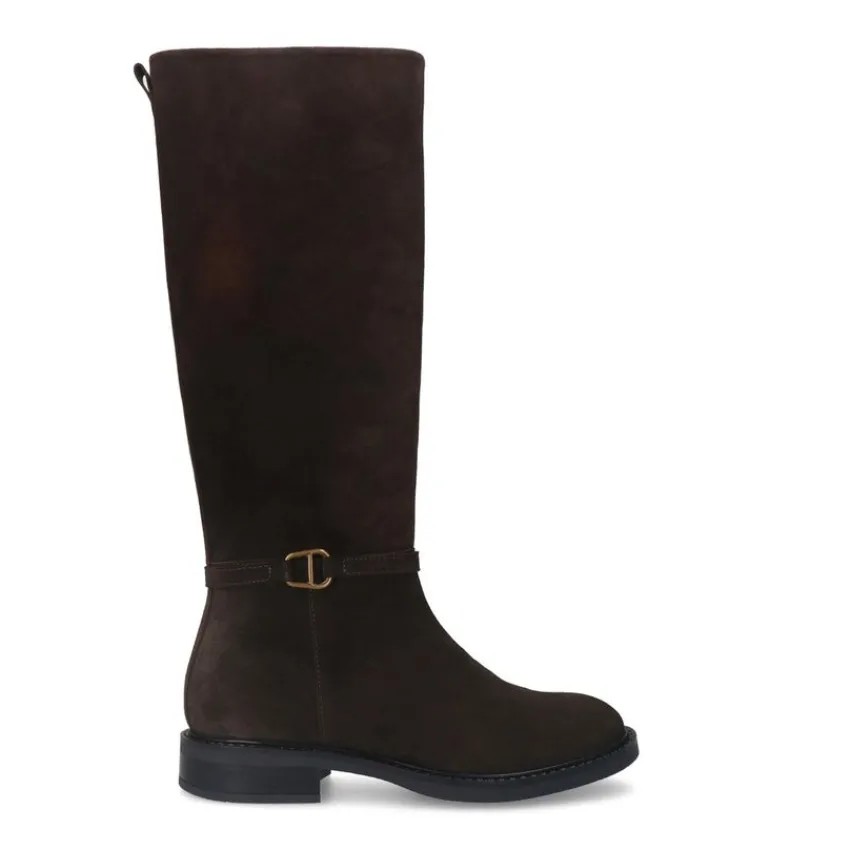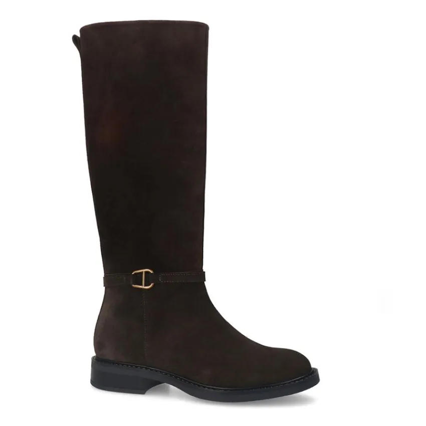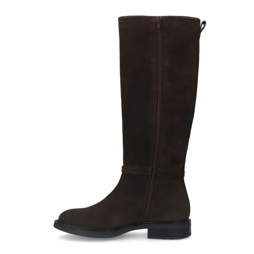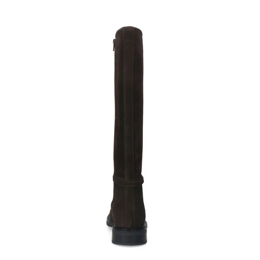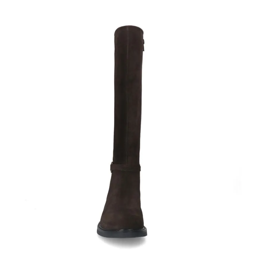 Bruine suède hoge laarzen van Manfield met gespdetail aan de zijkant en platte hak van 3 cm. De laarzen hebben een schachthoogte van 40 cm en een schachtbreedte van 38 cm, gemeten bij een maat 37. We adviseren als verzorging en bescherming de suède/nubuck spray in transparant.