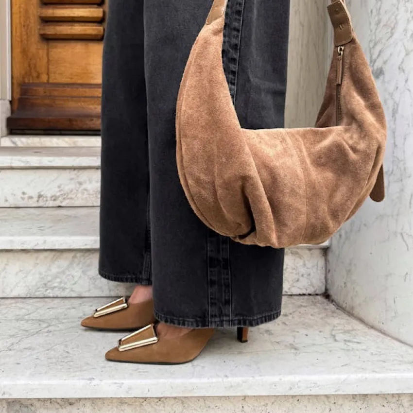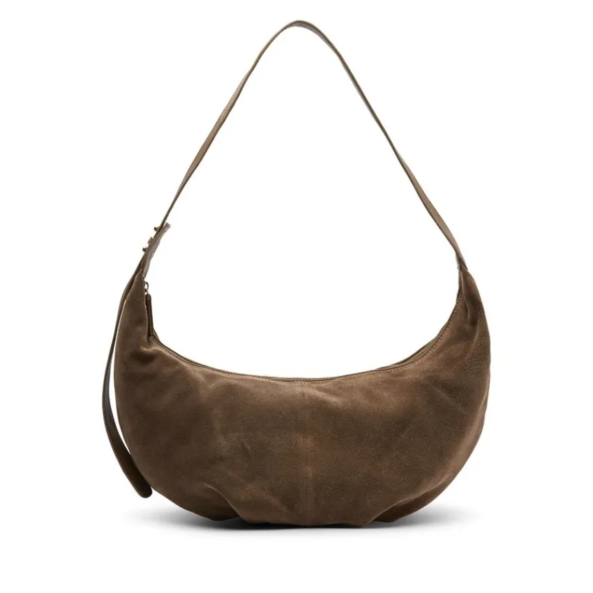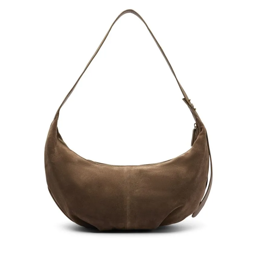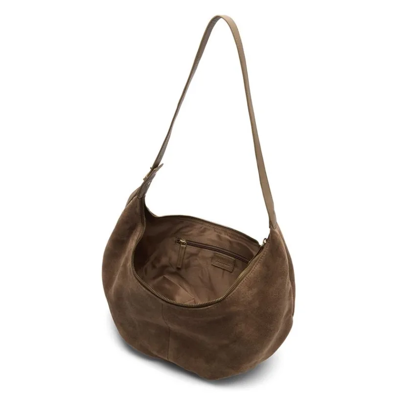 Bruine suède schoudertas van Manfield met verstelbare schouderband. De afmeting van deze tas is 46x21x13 cm (BxHxD), voorzien van een ritssluiting.