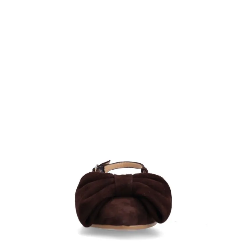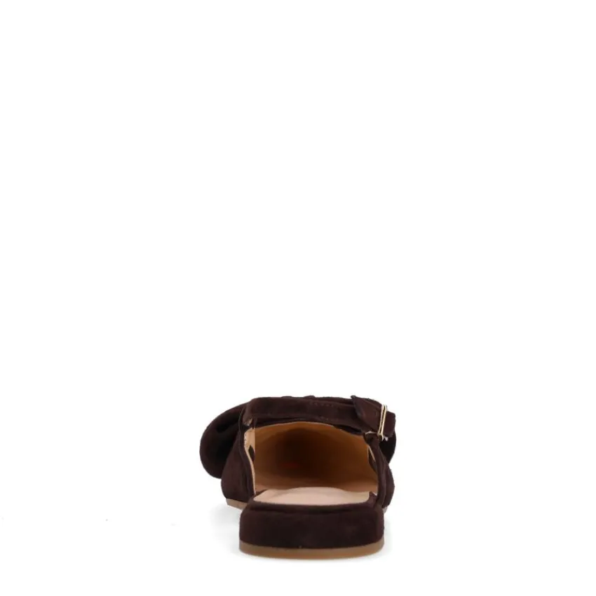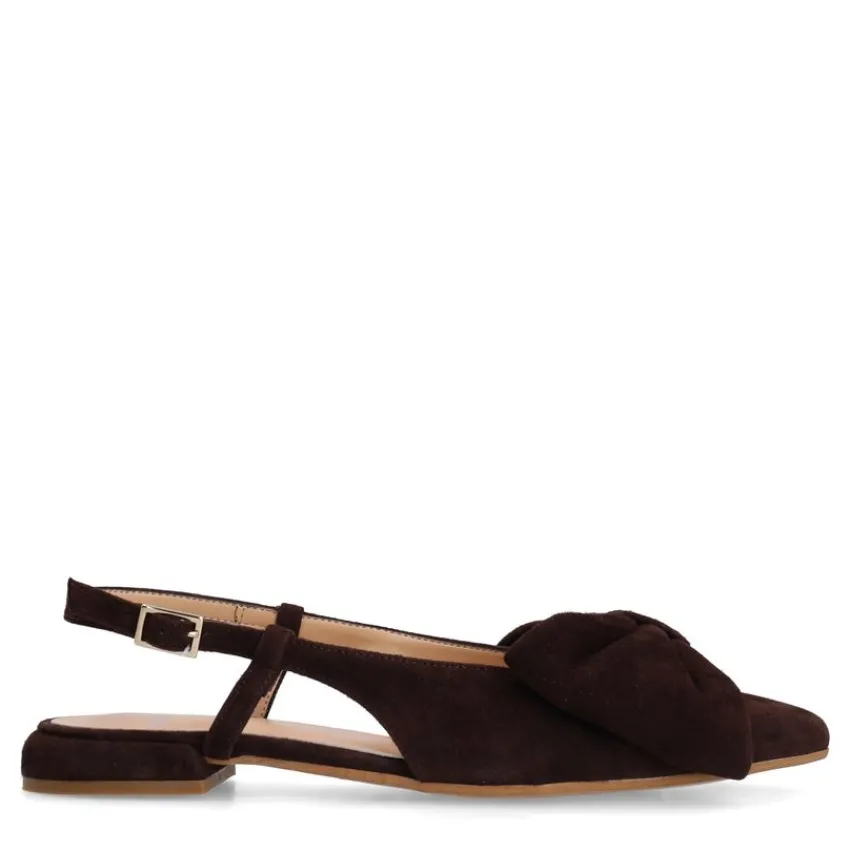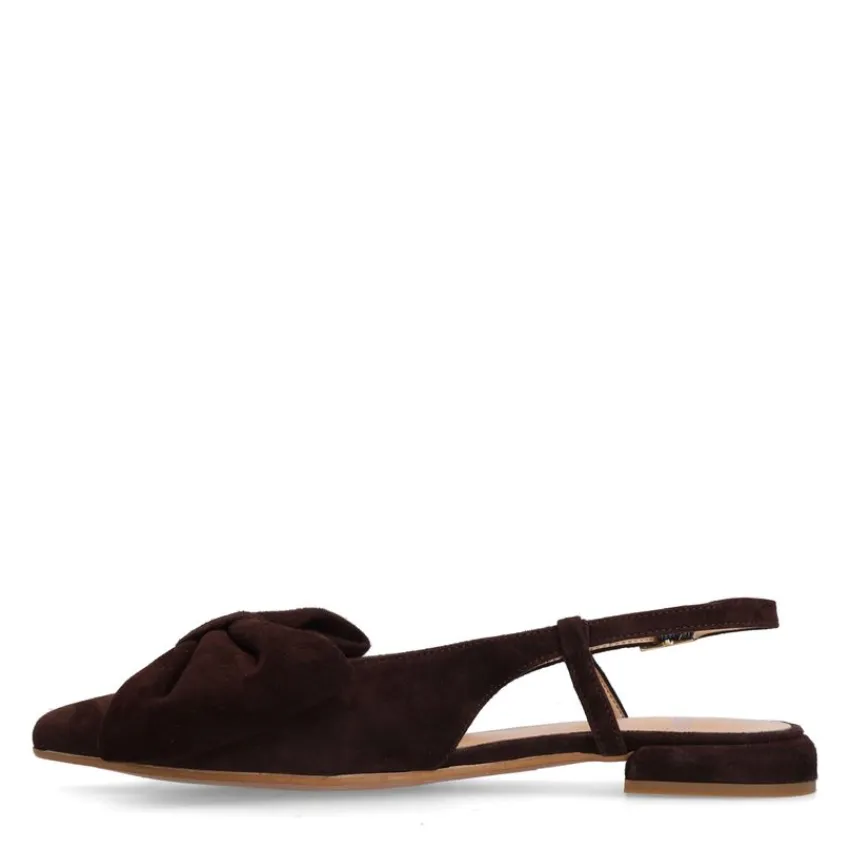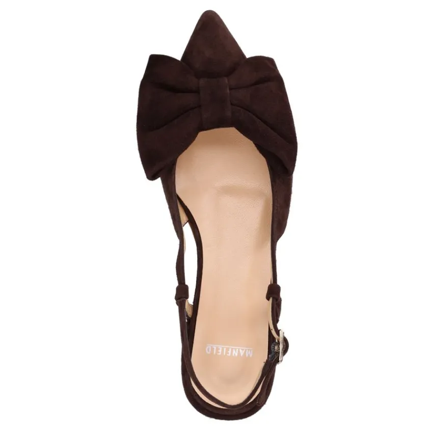 Bruine suède slingbacks met strik op de voorvoet van Manfield. De slingbacks hebben een platte hak van 2 cm, een puntige neus en een gespsluiting. We adviseren als verzorging en bescherming de suède/nubuck spray in transparant.