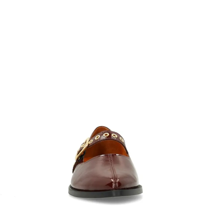 Burgundy lakleren loafers van Manfield met een gespsluiting die over de voorvoet heen loopt en platte hak van 1 cm. We adviseren als verzorging en bescherming de Natural Trendspray.