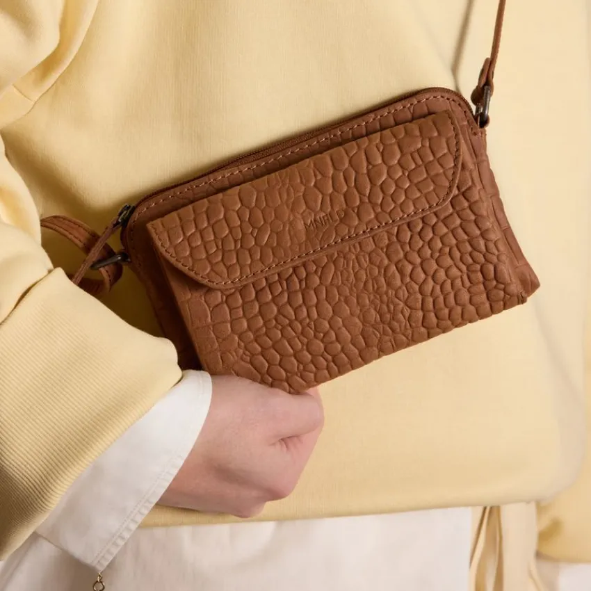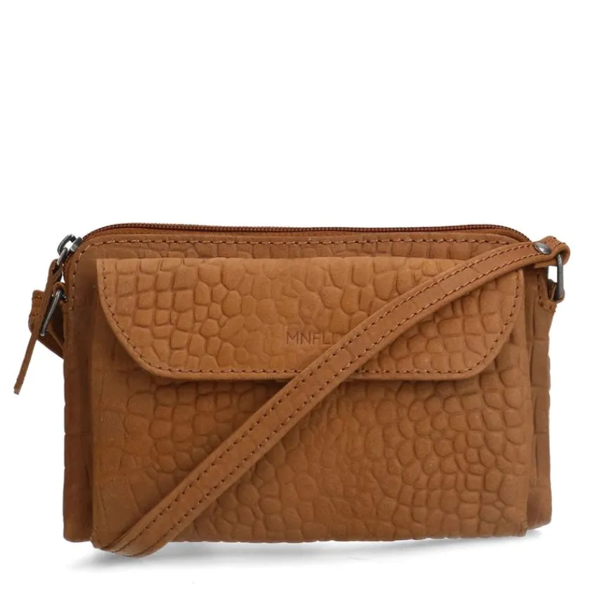 Cognac leren croco clutch van Manfield met verstelbare band van 125 cm, zijvakje met drukknoopsluiting en ritssluiting. De afmeting van de tas is 19x13x4 cm (BxHxD).
