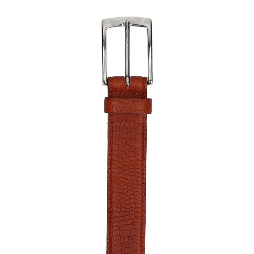 Cognac leren croco riem van Manfield met een zilveren gesp. De riem heeft een totale lengte van 110 cm en een breedte van 3 cm.