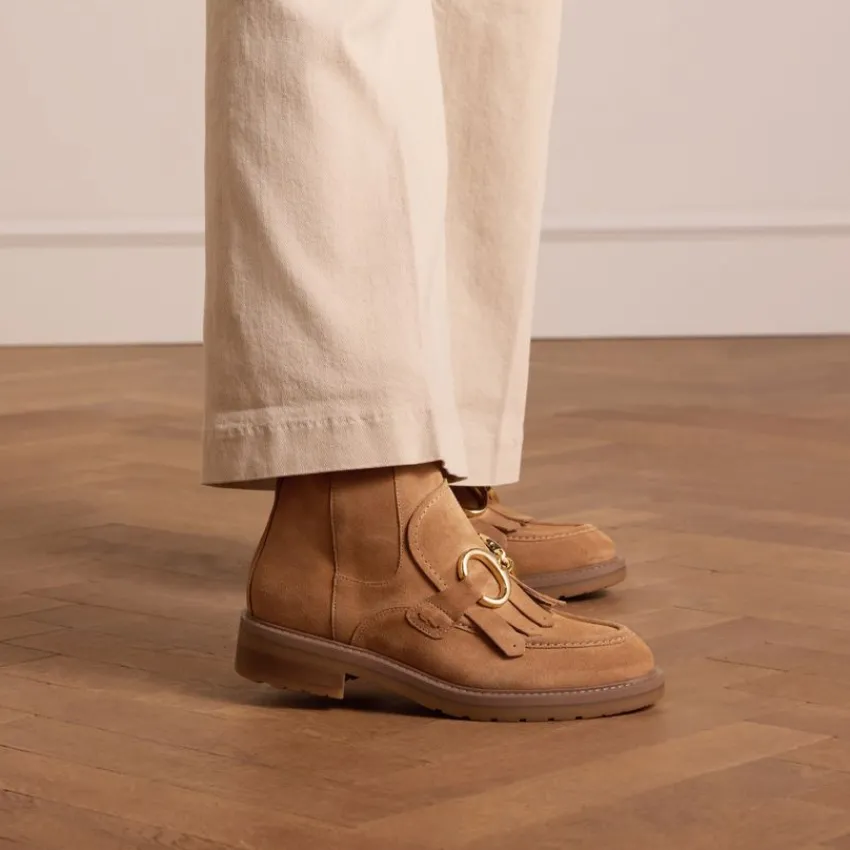 Cognac leren enkellaarsjes van Manfield met hak van 4 cm, ritssluiting aan de binnenzijde, gouden chain op de voorvoet en verschillende details. De enkellaarsjes hebben een schachthoogte van 17 cm. We adviseren als verzorging en bescherming de Collonil Carbon Pro.