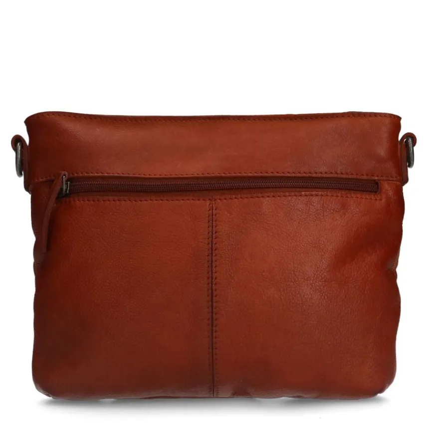 Cognac leren schoudertas van Manfield. De afmeting van deze tas is 27x21x5 cm (BxHxD), voorzien van een verstelbare schouderband van 118 cm en een ritssluiting aan de bovenkant en aan de zijkant.