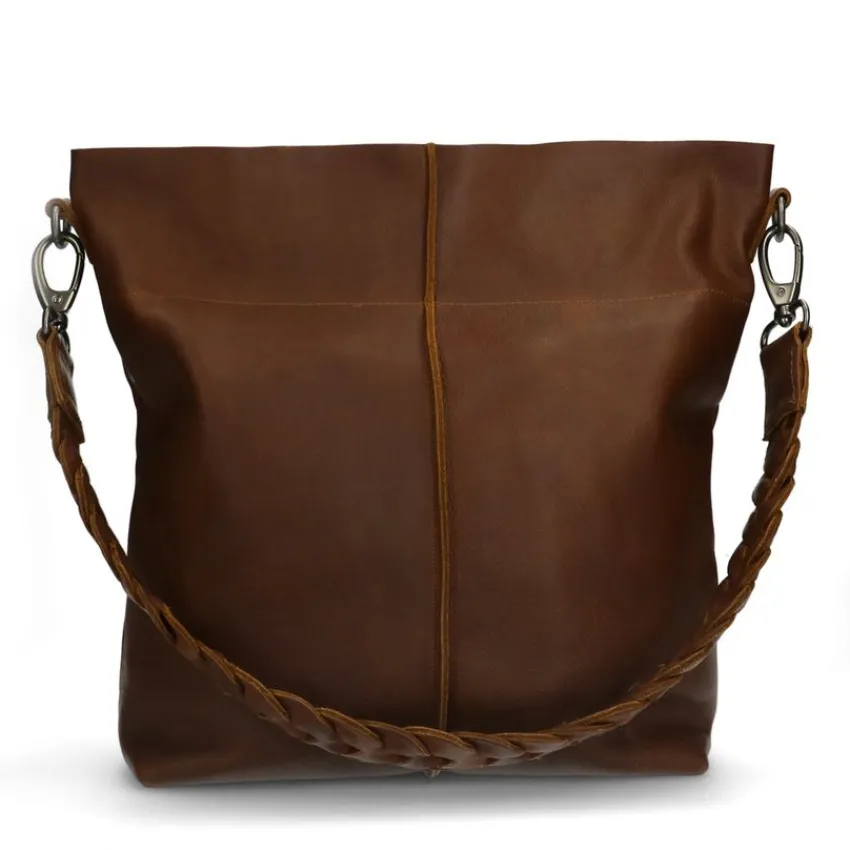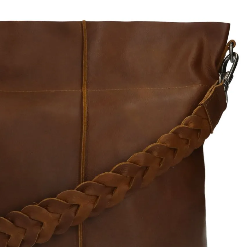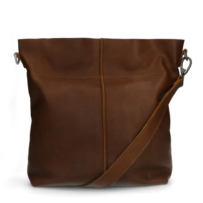 Cognac leren shopper met hengsel van het merk Manfield, met een afmeting van 35x31x12 (BxHxD). Het hengsel heeft een lengte van 68 cm. De shopper heeft een ritsvakje aan de achterzijde en sluit door middel van een rits. Er zit ook een verstelbaar hengsel bij met een totale lengte van 150 cm.