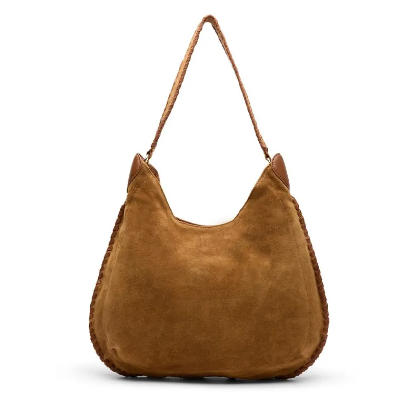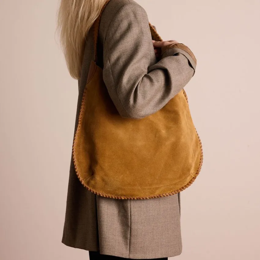 Cognac suède handtas met gevlochten details van Manfield. De afmeting van deze tas is 43x32x7 cm (BxHxD), voorzien van een drukknoop sluiting.
