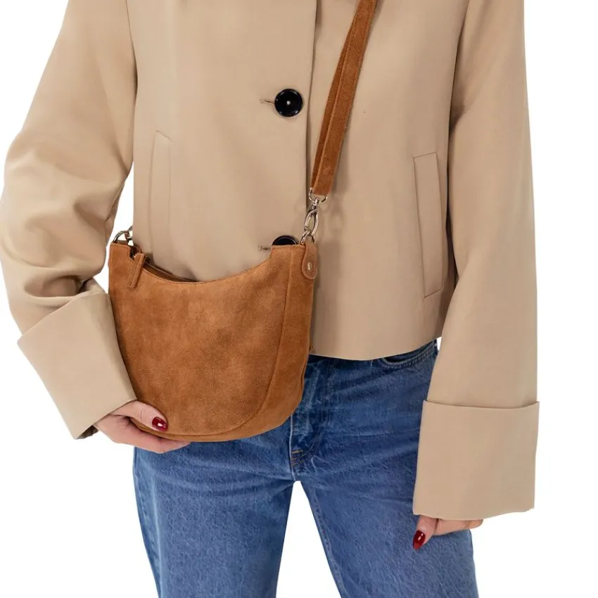 Cognac suède schoudertas van Manfield. De afmeting van deze tas is 24x16x6 cm (BxHxD), voorzien van een ritssluiting, zijvakje en een verstelbare band van 133 cm. We adviseren als verzorging en bescherming de suède/nubuck spray in transparant.