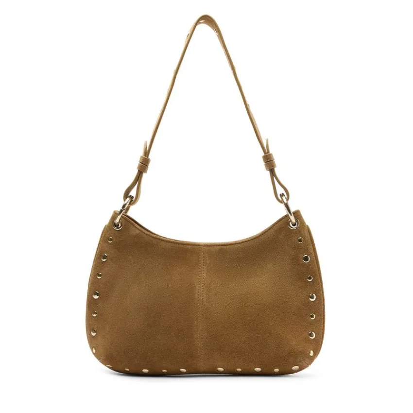 Cognac suède schoudertasje met gouden studs van Manfield. De tas heeft een ritssluiting en gouden haakjes voor de schouderband.