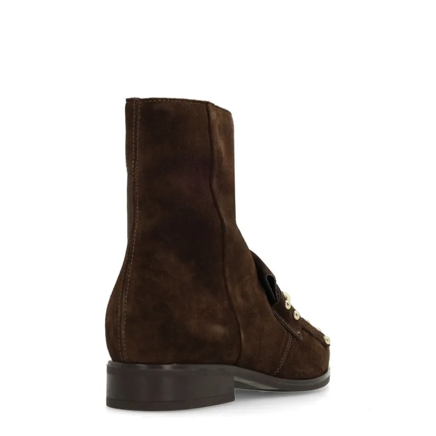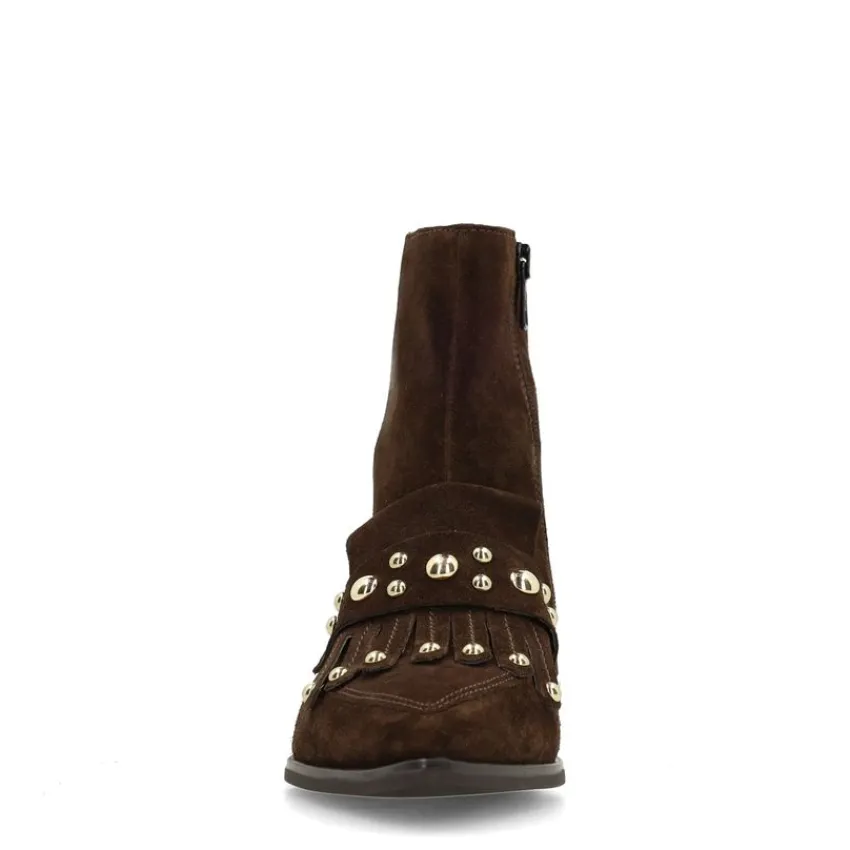 Donkerbruine suède enkellaarsjes met studs details op de voorvoet van Manfield. De enkellaarsjes hebben een puntneus, ritssluiting aan de binnenzijde en platte hak van 2 cm. We adviseren als verzorging en bescherming de suède/nubuck spray in transparant.