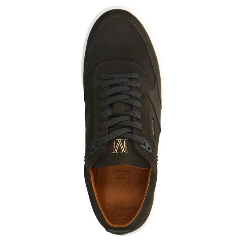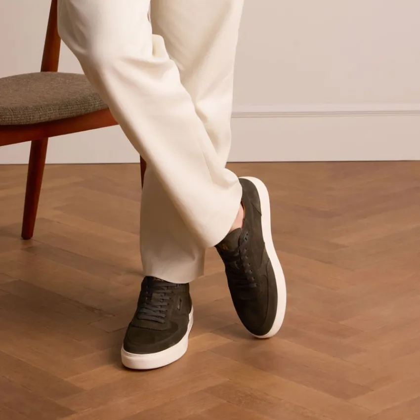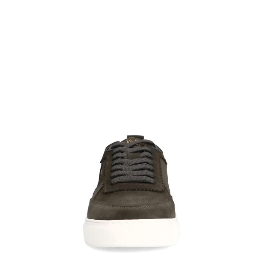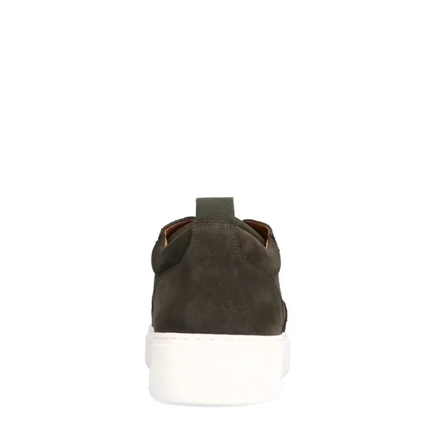 Donkergroene suède sneakers van Manfield met witte zool van 3 cm en details aan de zijkant. We adviseren als verzorging en bescherming de Collonil Carbon Pro.