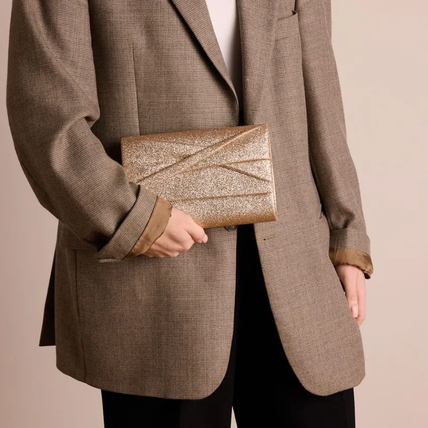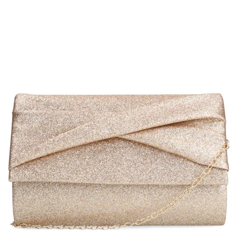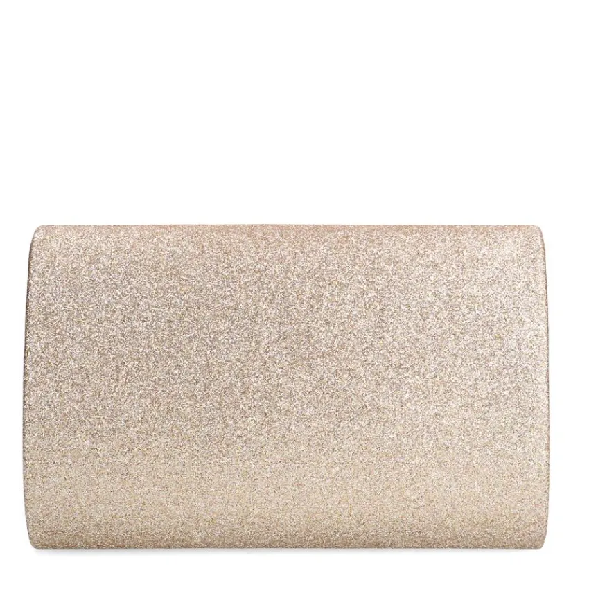 Gouden glitter clutch van Manfield met drukknoop sluiting. De afmeting van de clutch is 21x14x4 cm (BxHxD), voorzien van zilveren strap van 115 cm.