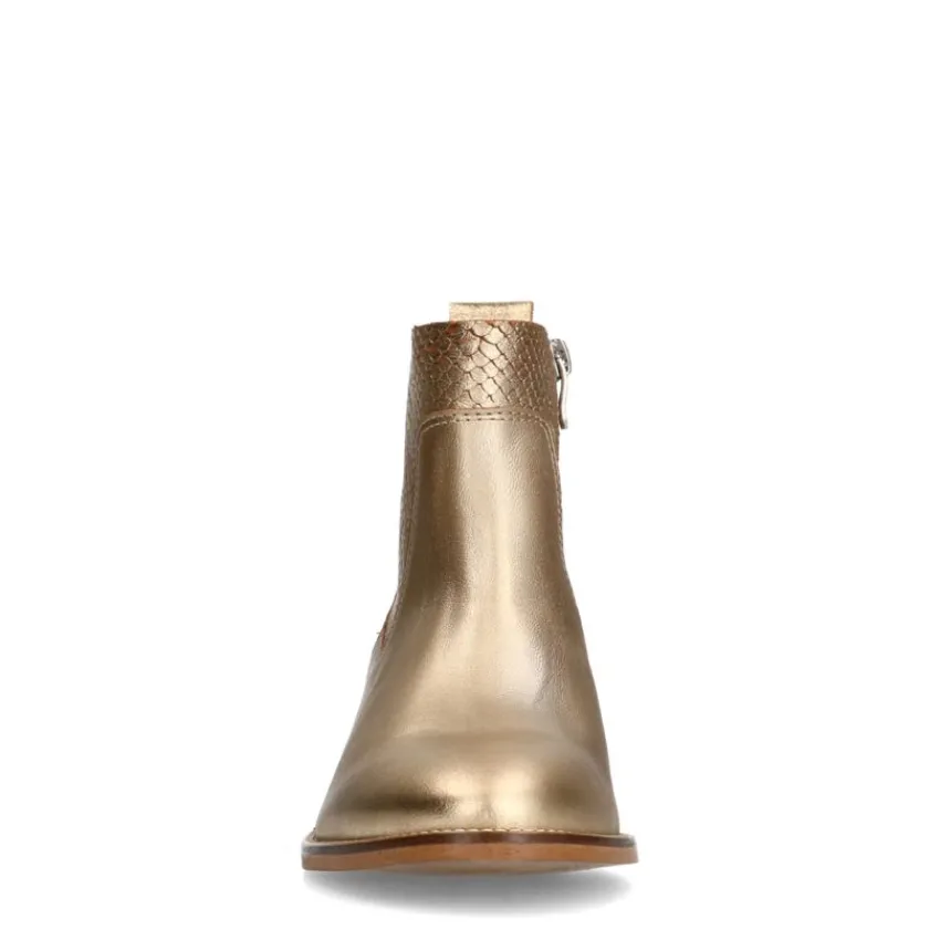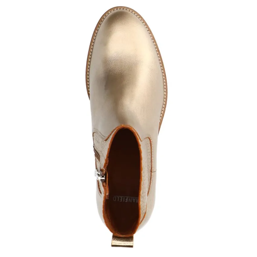 Gouden leren cowboylaarsjes van Manfield, met een blokhak van 3 cm. De laarsjes hebben een ronde neus en een ritssluiting aan de binnenzijde. We adviseren als verzorging en bescherming de Collonil Carbon Pro.