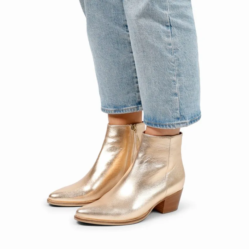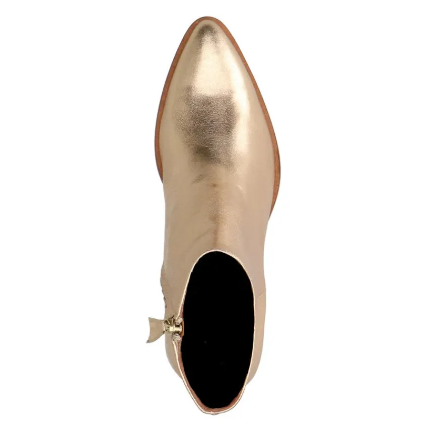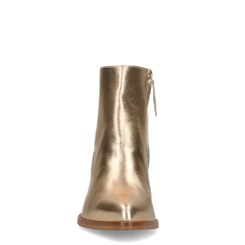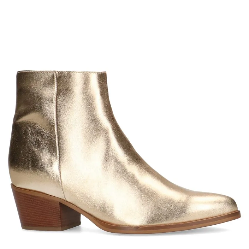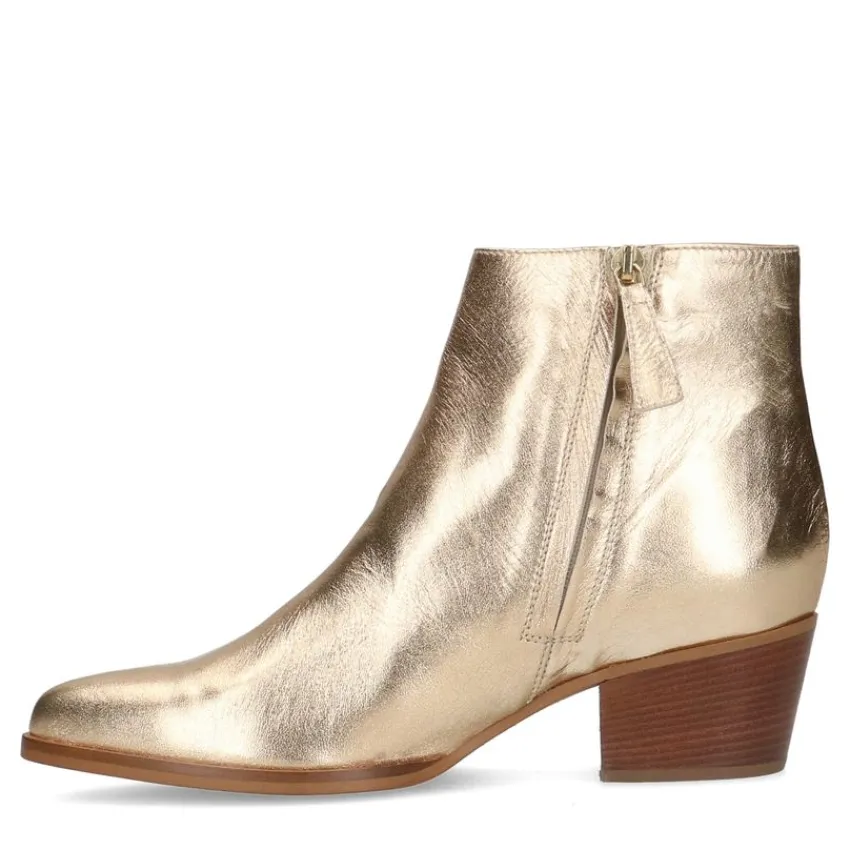 Goudkleurige leren enkellaarsjes van Manfield met een puntige neus en platte hak van 3 cm. We adviseren als verzorging en bescherming de Collonil Carbon Pro of metallic spray.